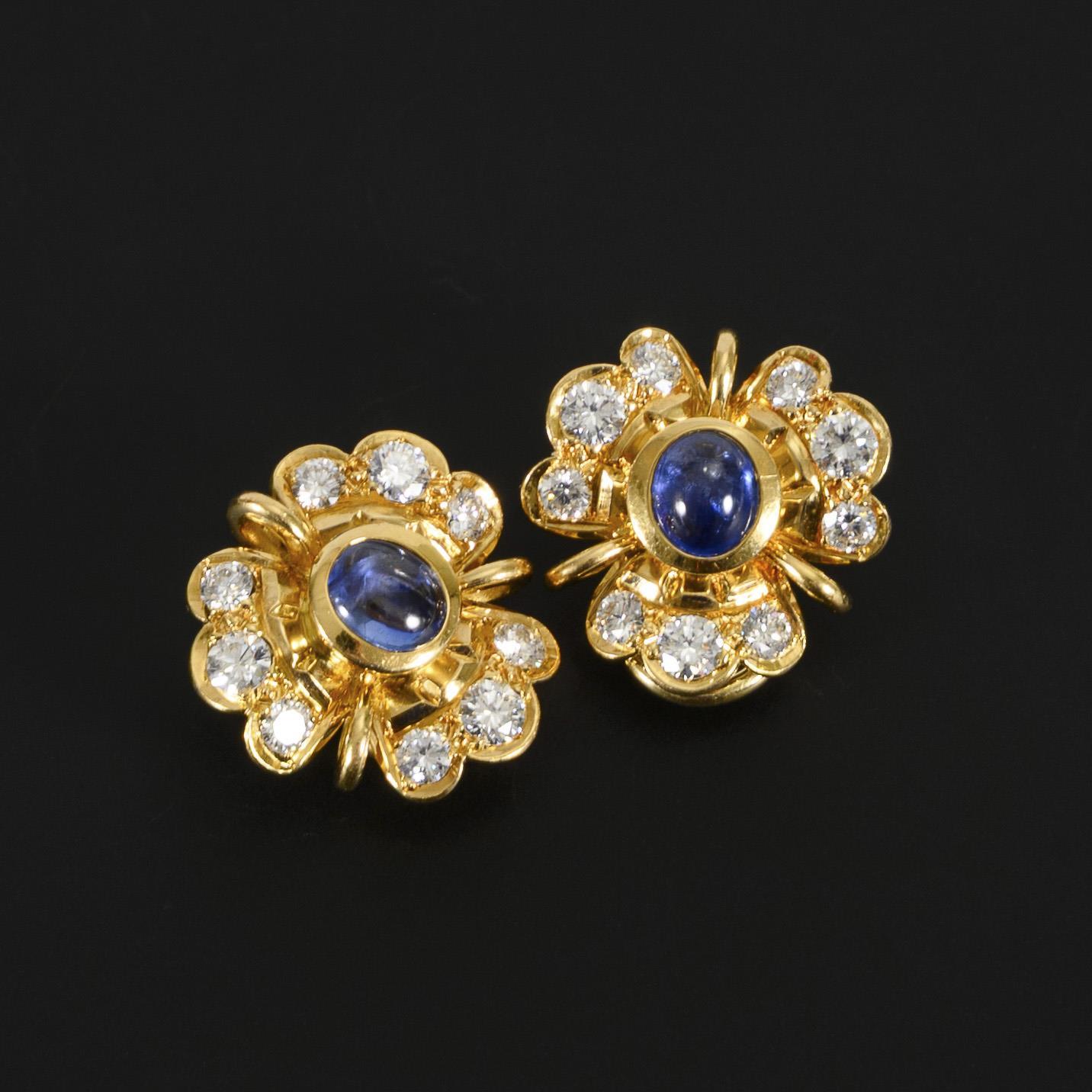 Ohrclips in Form von Kleeblättern, diese je mittig mit einem Saphir-Cabochon besetzt, dieser auf den Blättern von insgesamt je 9 Brillanten eingerahmt.