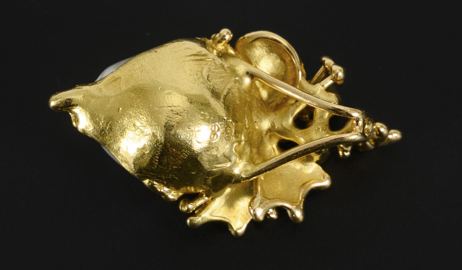 Gelbgold 750 gestempelt. Der Anhänger max. ca. 32,79 x 18,19 mm, die Perle (in der Fassung gemessen) ca. 16,0 x 12,80 mm. 10,3 g.