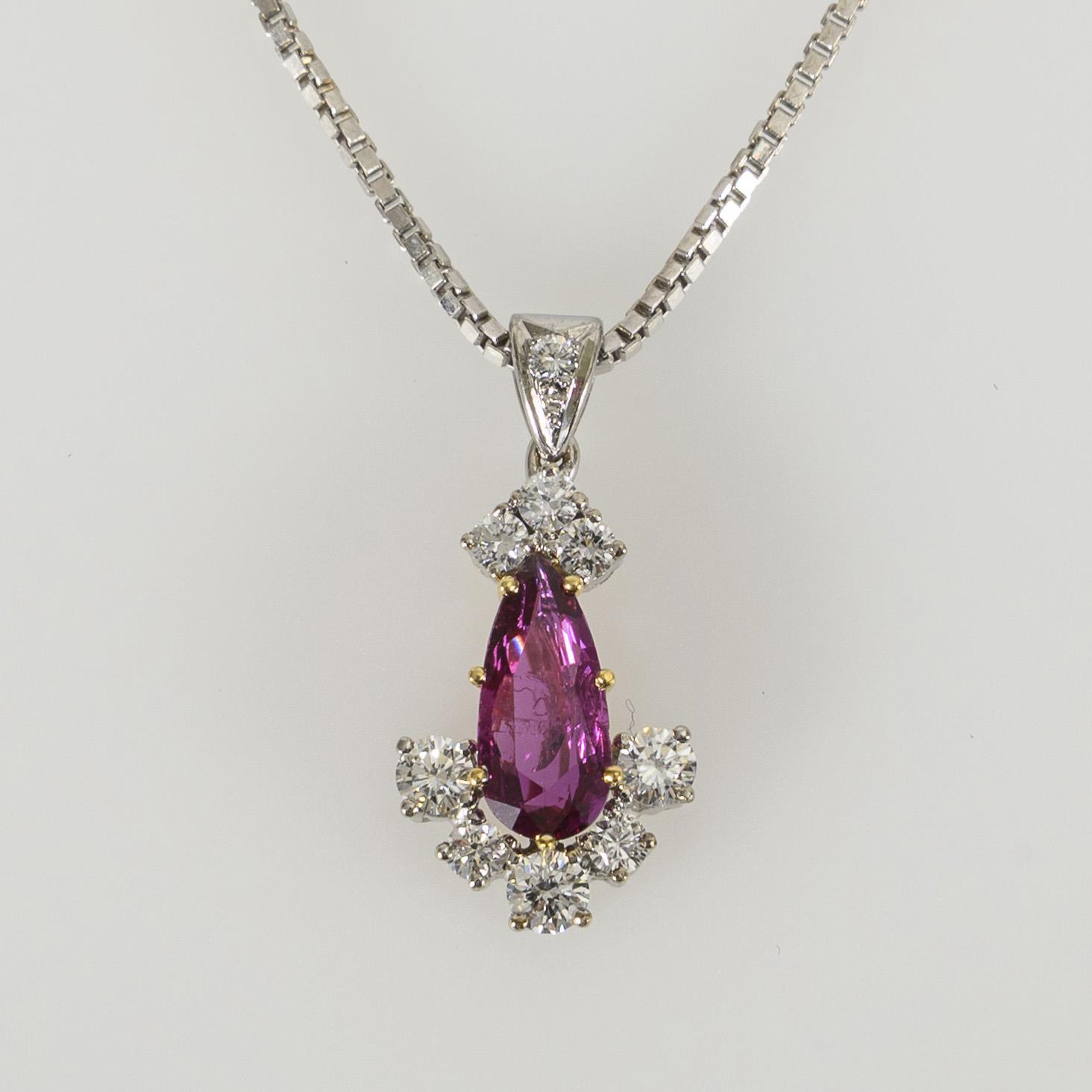 An einer Venezianerkette mit Federringverschluss ein Anhänger mit einem tropfenförmigen Rubin, umgeben von insgesamt 8 Brillanten. Ein weiterer Brillant ist in die bewegliche Öse des Anhängers eingelassen.