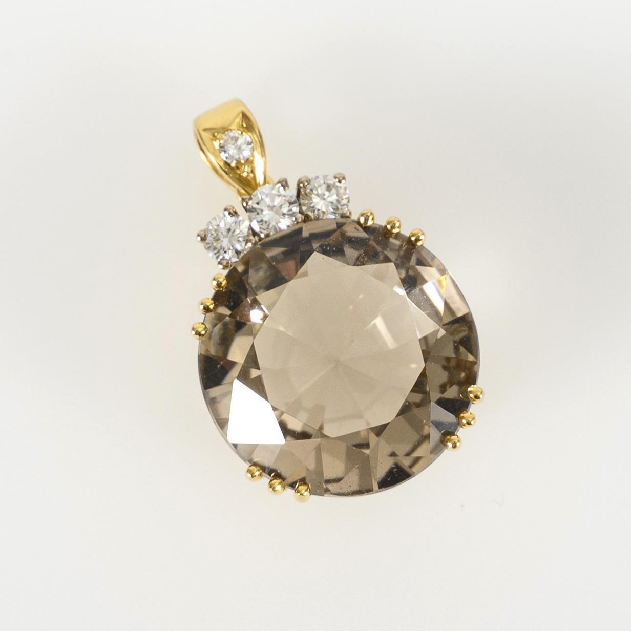 Anhänger mit einem rundfacettierten Rauchquarz, darüber 3 Brillanten in Chatonfassung sowie ein weiterer Brillant, eingelassen in der beweglichen Öse.