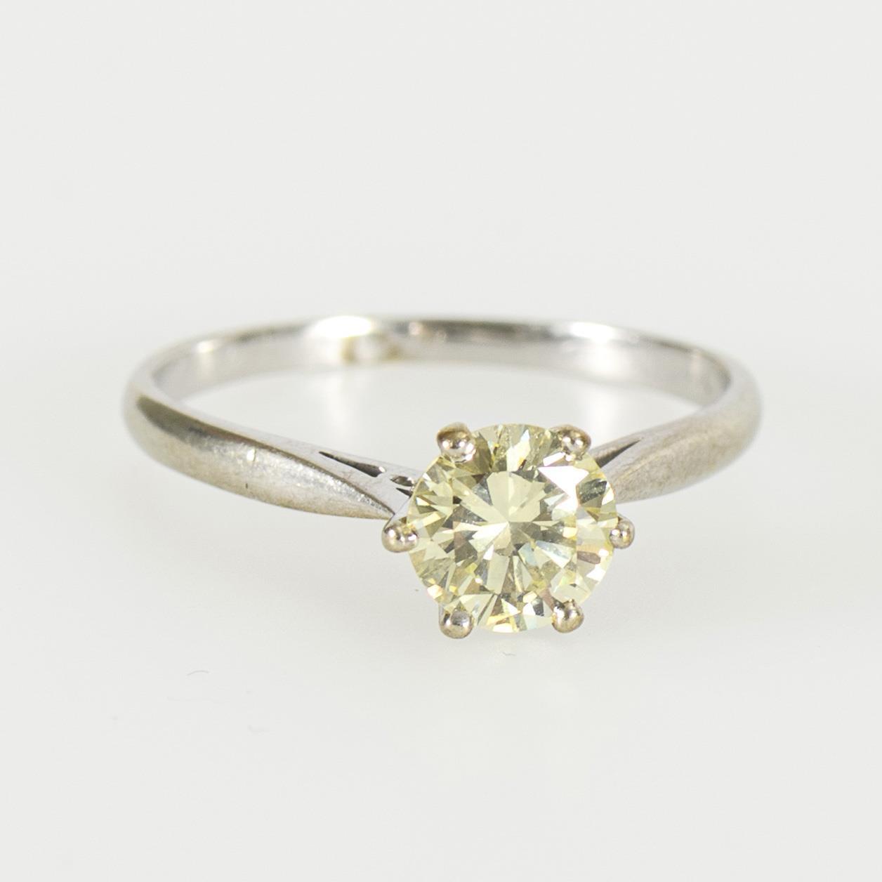 Weißgold 750 gestempelt. Ringgröße 57, Durchmesser des Brillanten (in der Fassung gemessen) ca. 6,40 mm. 2,38 g.