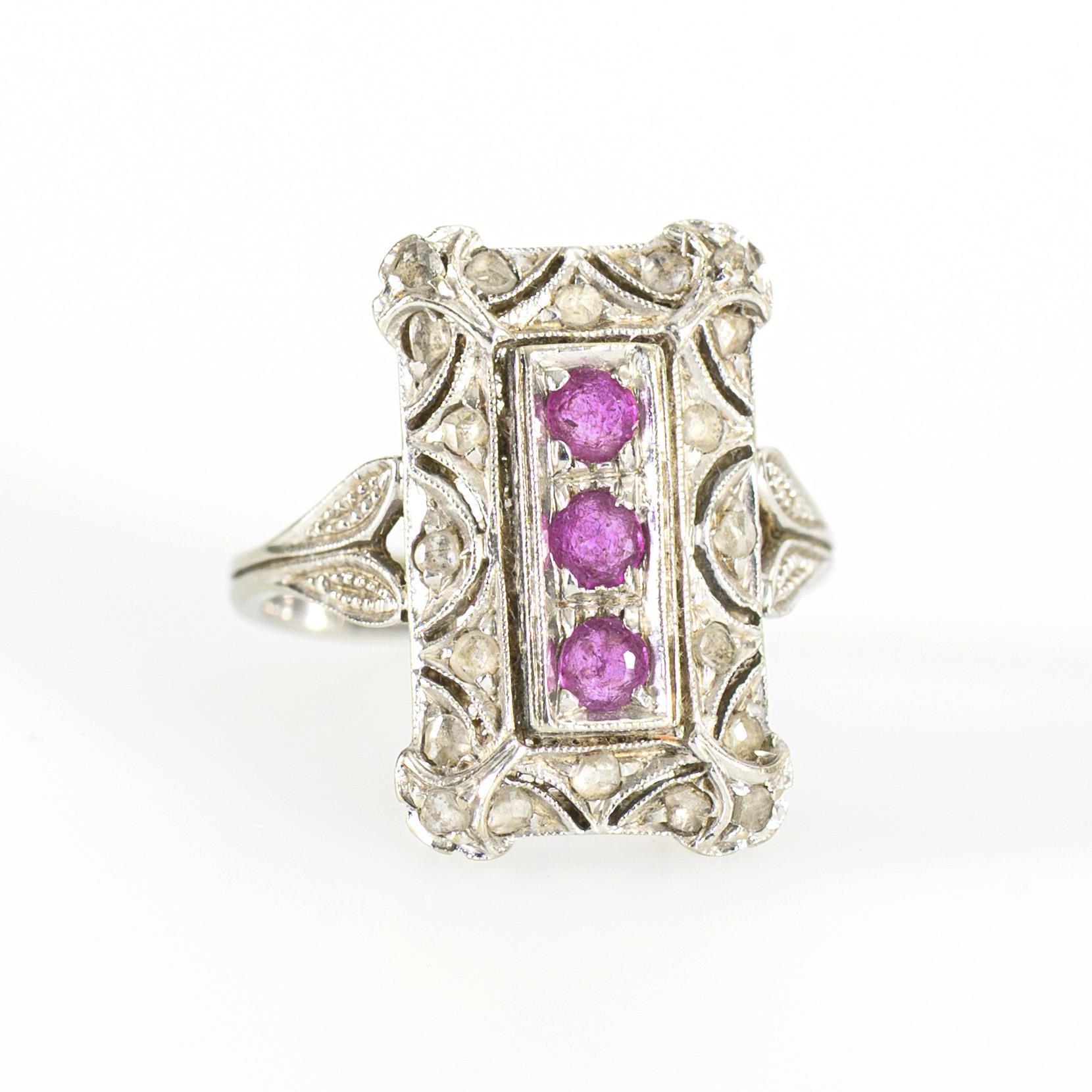 Historisierender Ring mit Diamanten und roten Farbsteinen.