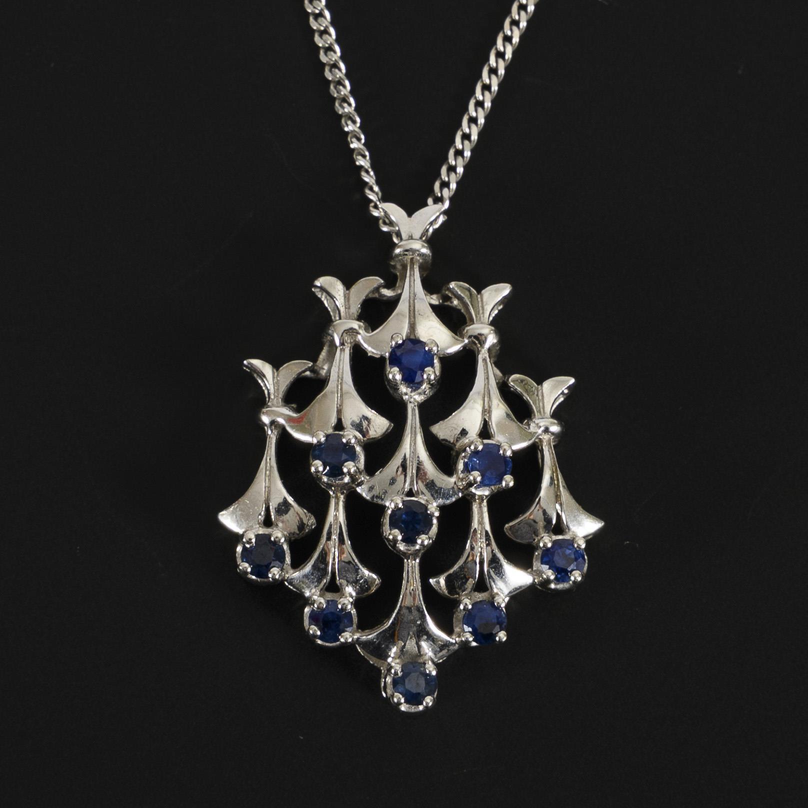 Anhänger mit blauen Farbsteinen, wohl Saphire, an Kette.