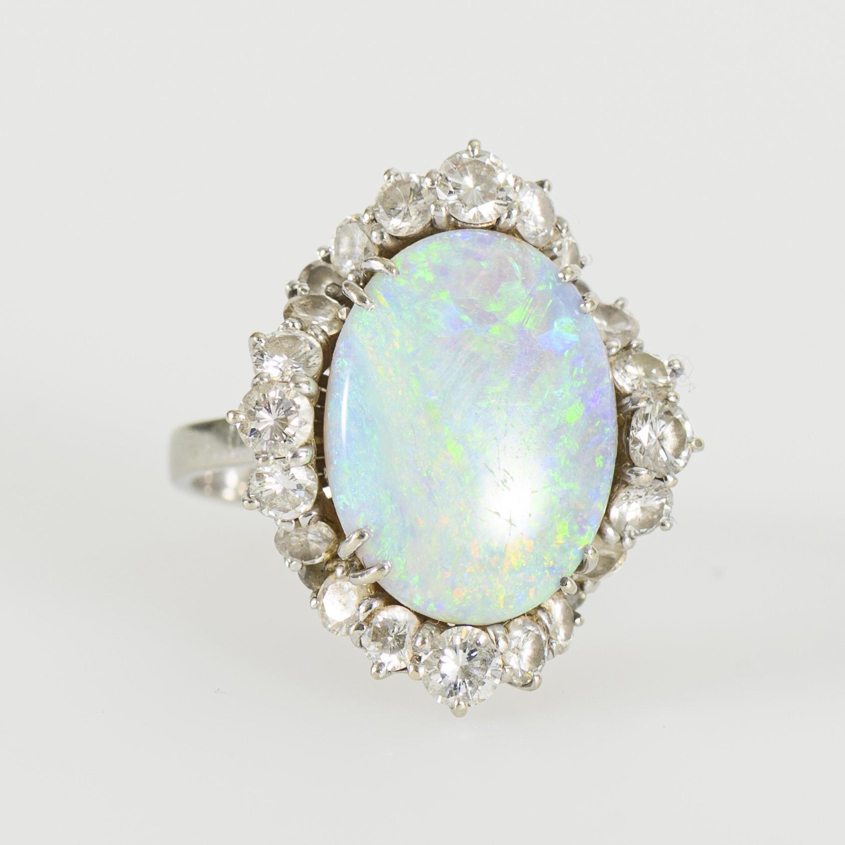 Ring mit Opal-Doublette als Oval-Cabochon, entourageartig von einem bewegt gestalteten Kranz aus Brillanten umgeben.