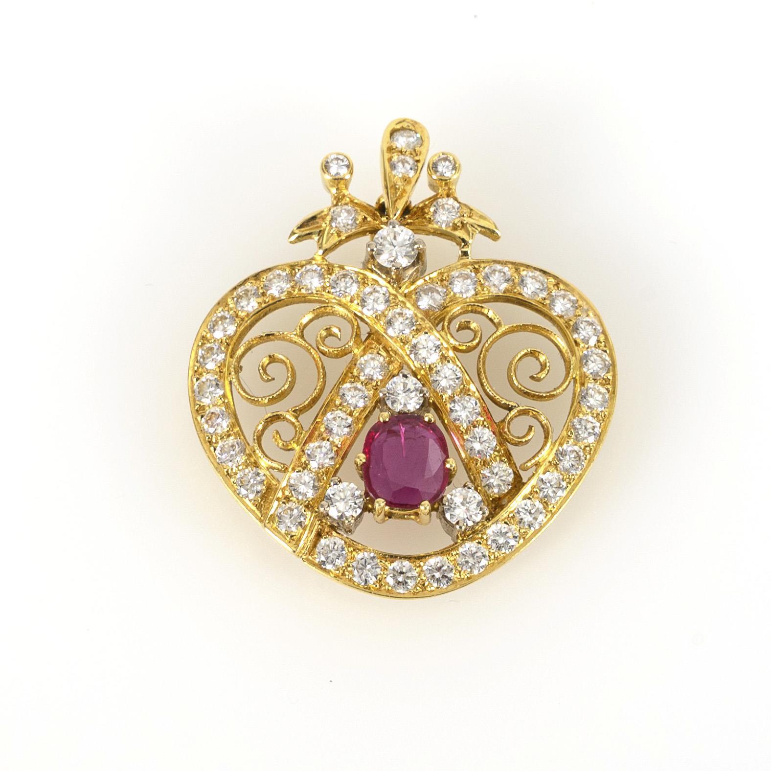 Sie befinden sich hier: Startseite Kategorien Schmuck Herzförmiger Anhänger mit rotem Farbstein, wohl Rubin, und Brillanten