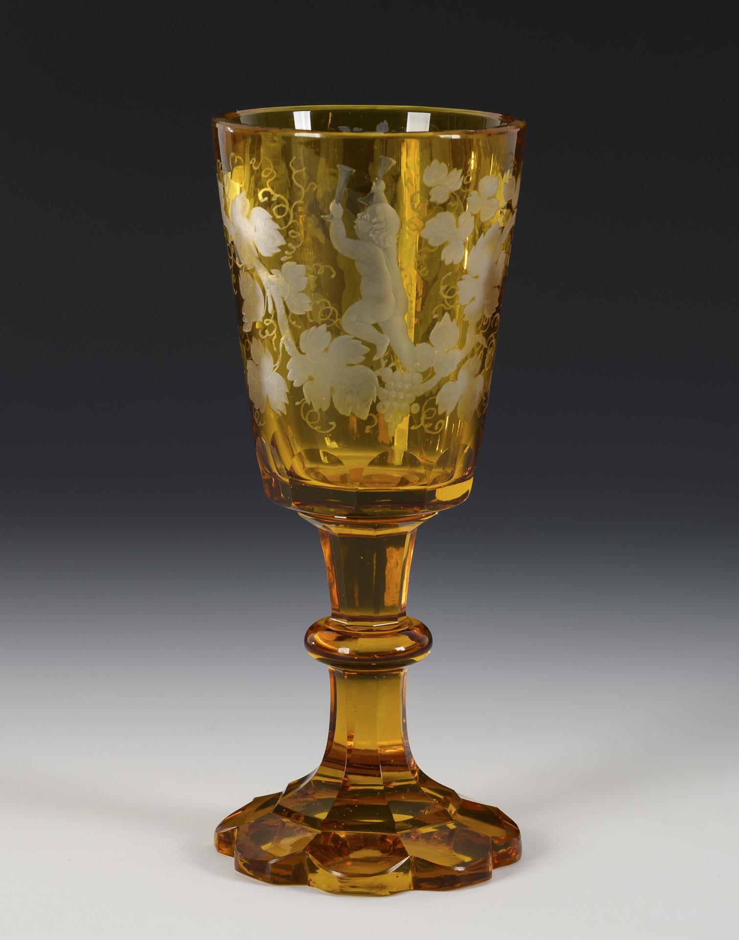 1x Kelchglas mit einem gravierten Weinstock mit Putten auf der konischen Kuppa. / 1x Kelchglas mit Kerb- und Facettenschliff. / 1x facettierter Fußbecher. Minimale Bestoßung an 2 Schliffkanten (Glas mit Kerbschliffdekor).