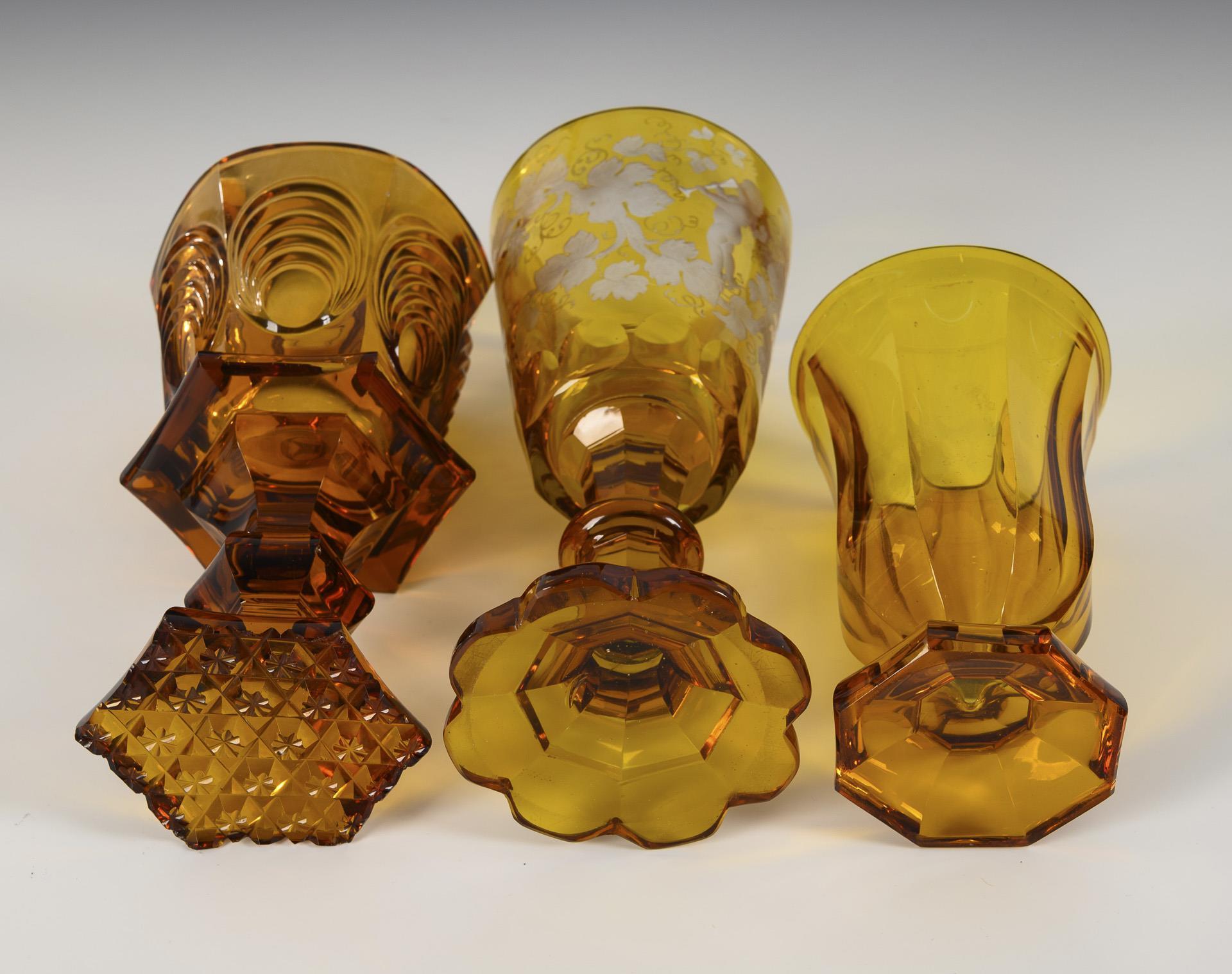 Farbloses, gelb gebeiztes Glas. H 20,5, 18,4 und 14 cm.