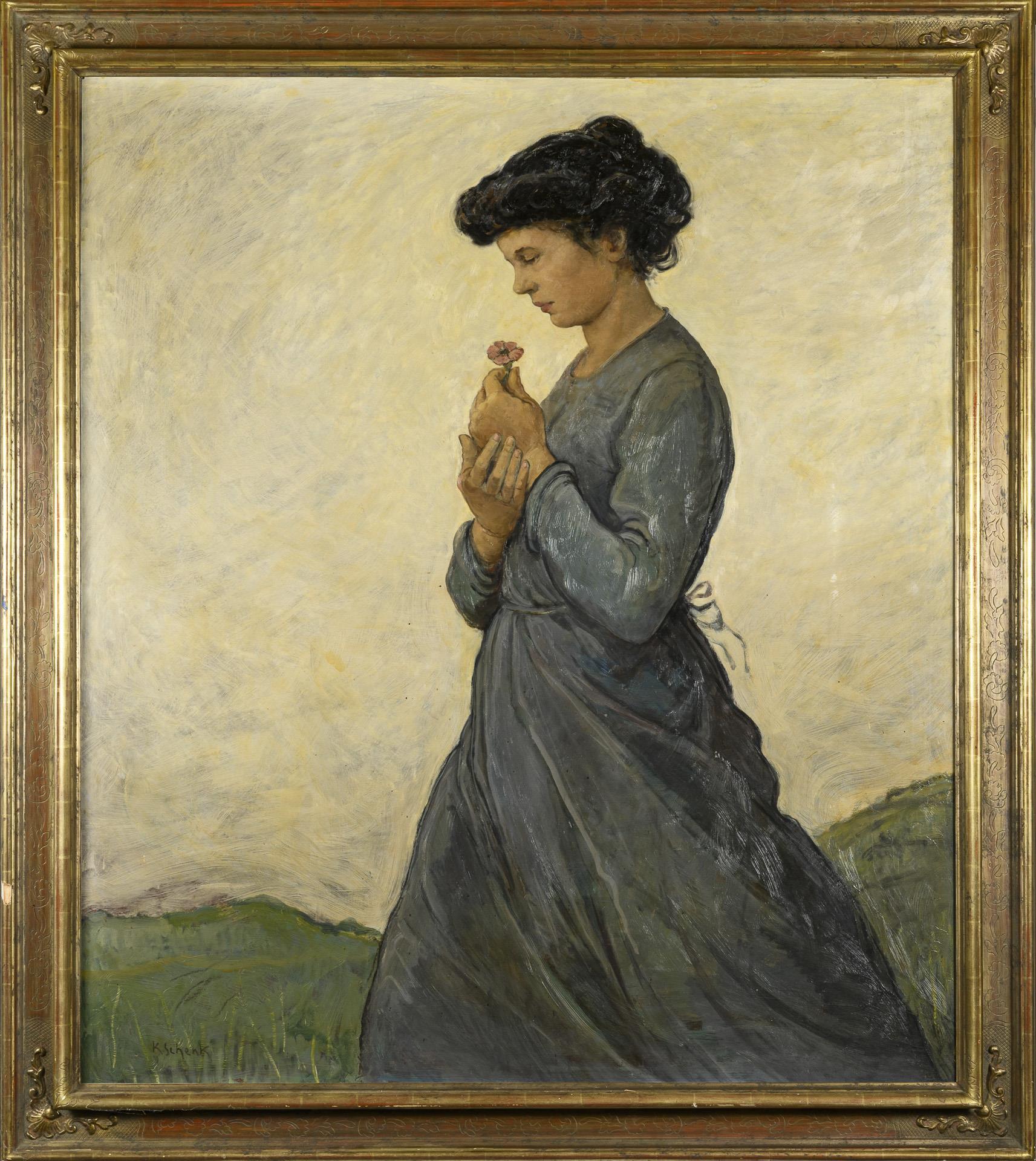 Porträt einer jungen Frau im blau-grauen Kleid mit einer keinen Blume unter bedecktem Himmel. Das Bild ist auf Website des Karl Schenk Museums abgebildet: https://www.karlschenkmuseum.ch/karl-schenk/.