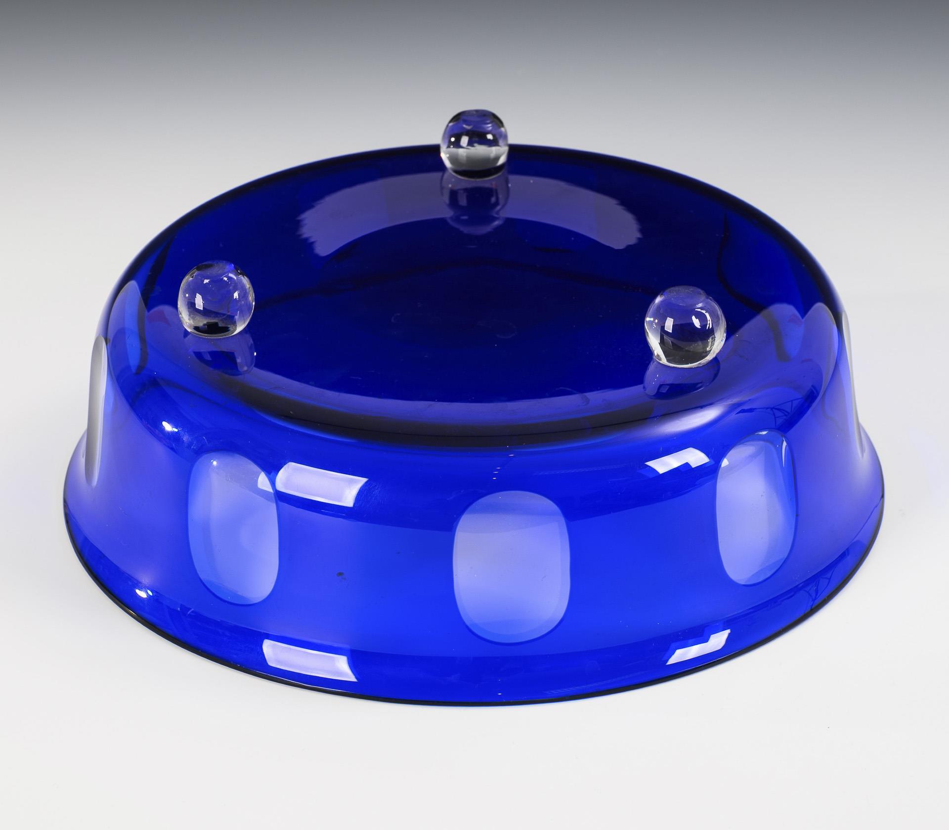 Nahezu zylindrische Schale aus farblosem Glas mit kobaltblauem Überfang und drei Kugelfüßen aus farblosem Glas. Auf der Wandung neun geschliffene, große Oliven.