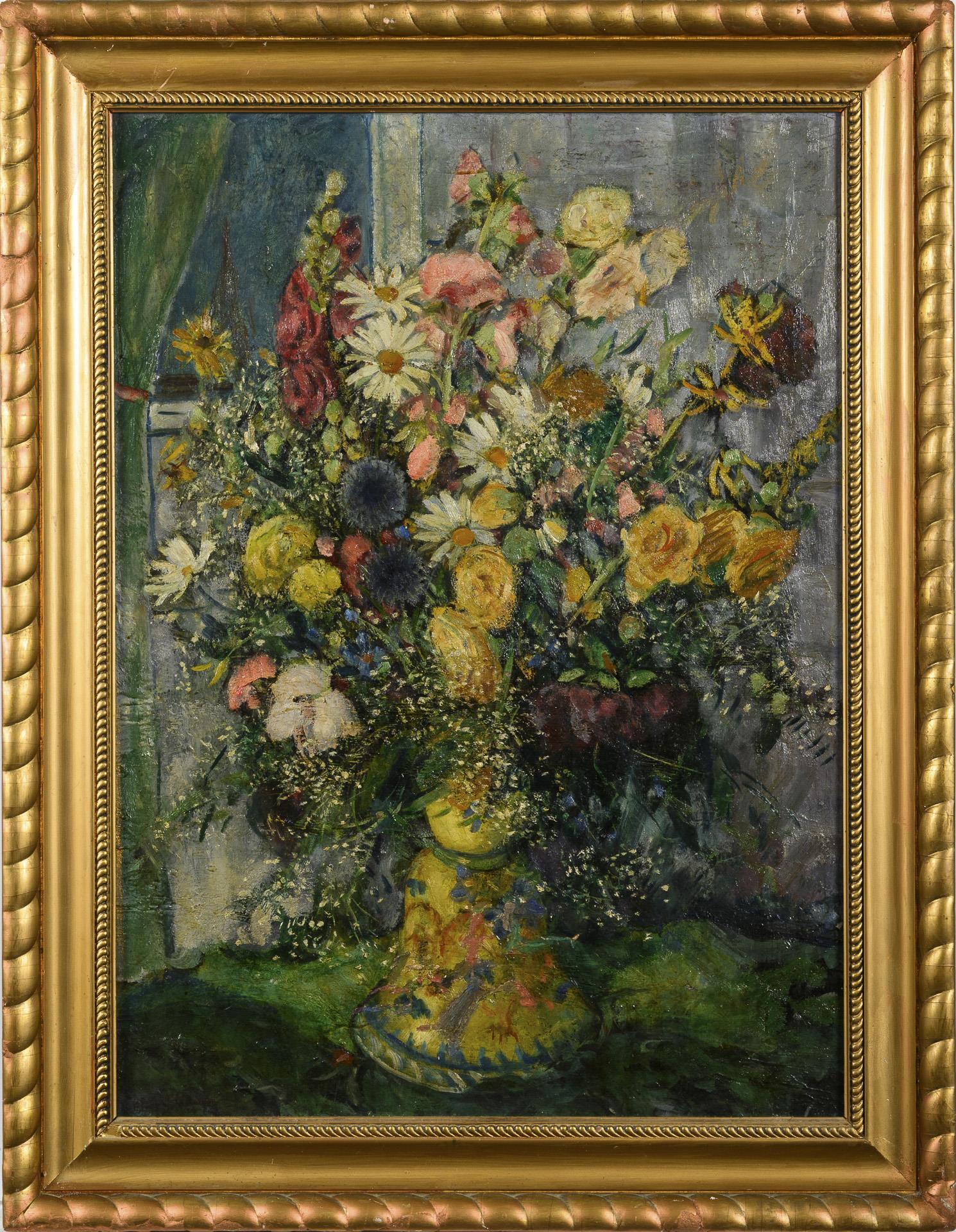 Großer Blumenstrauß in heller Vase auf grünem Tuch. Ein kleiner Defekt.