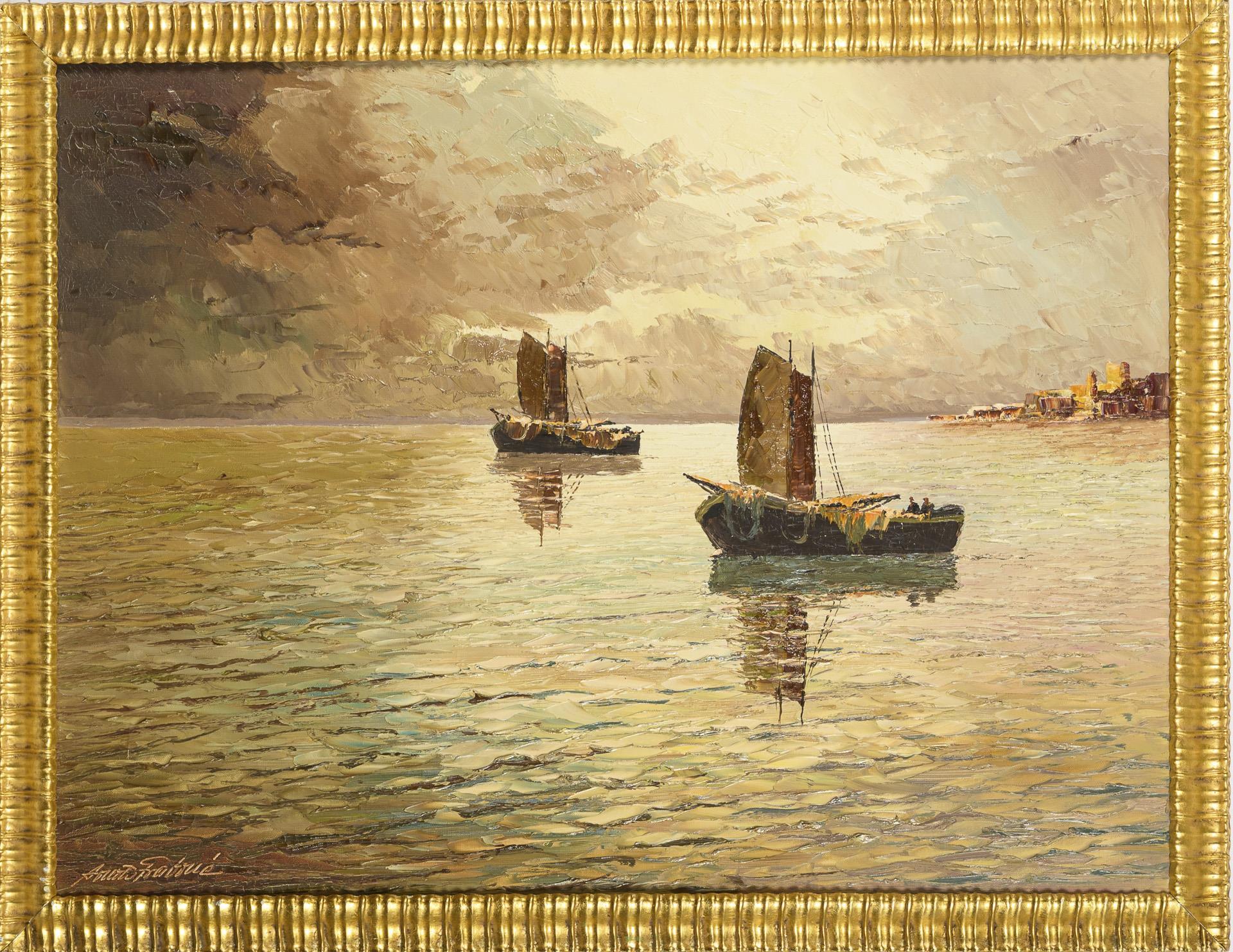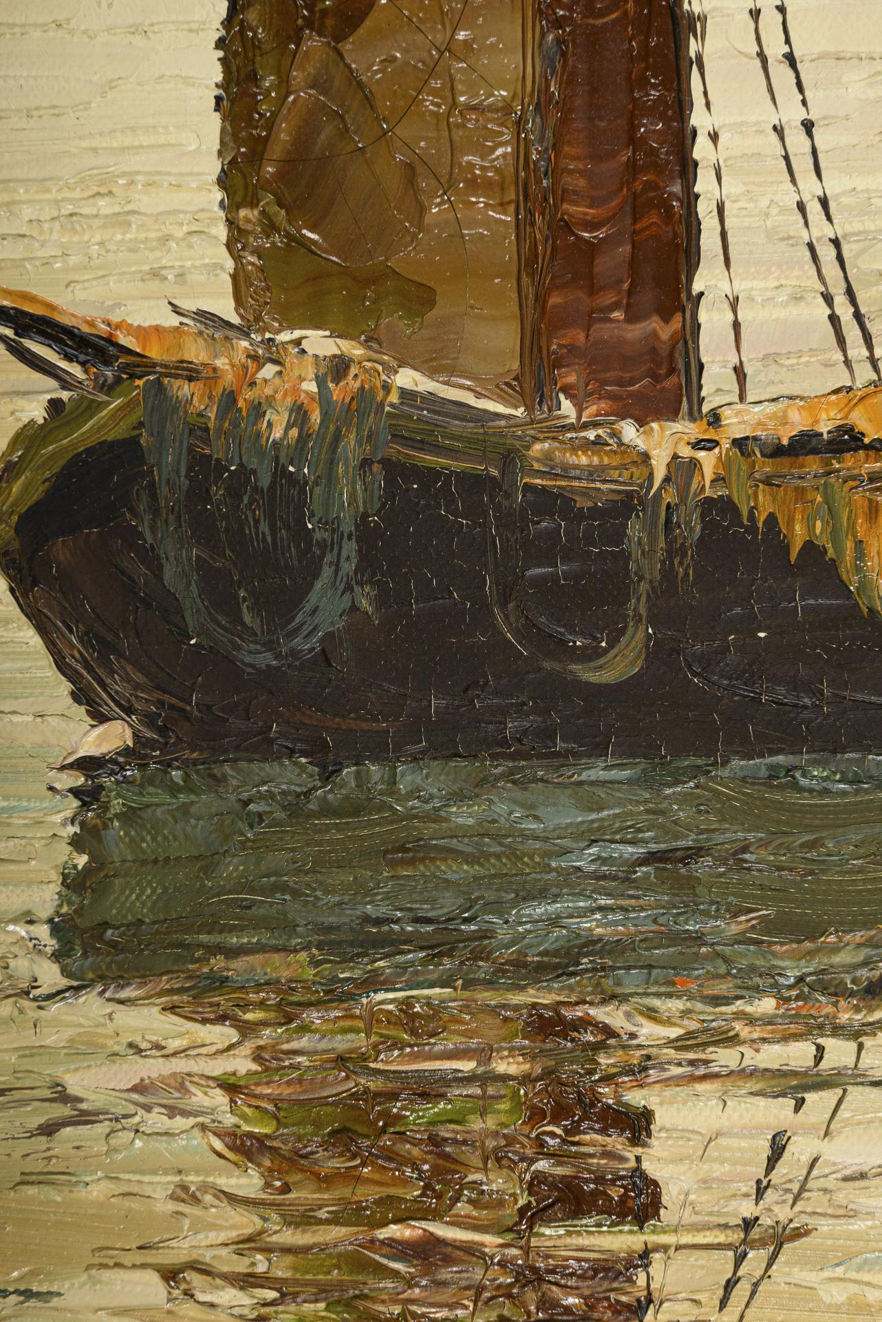 Zwei Fischerboote auf dem ruhigen Meer nahe der Küstenstadt am Abend. Eine kleine restaurierte Stelle mit Hinterklebung.