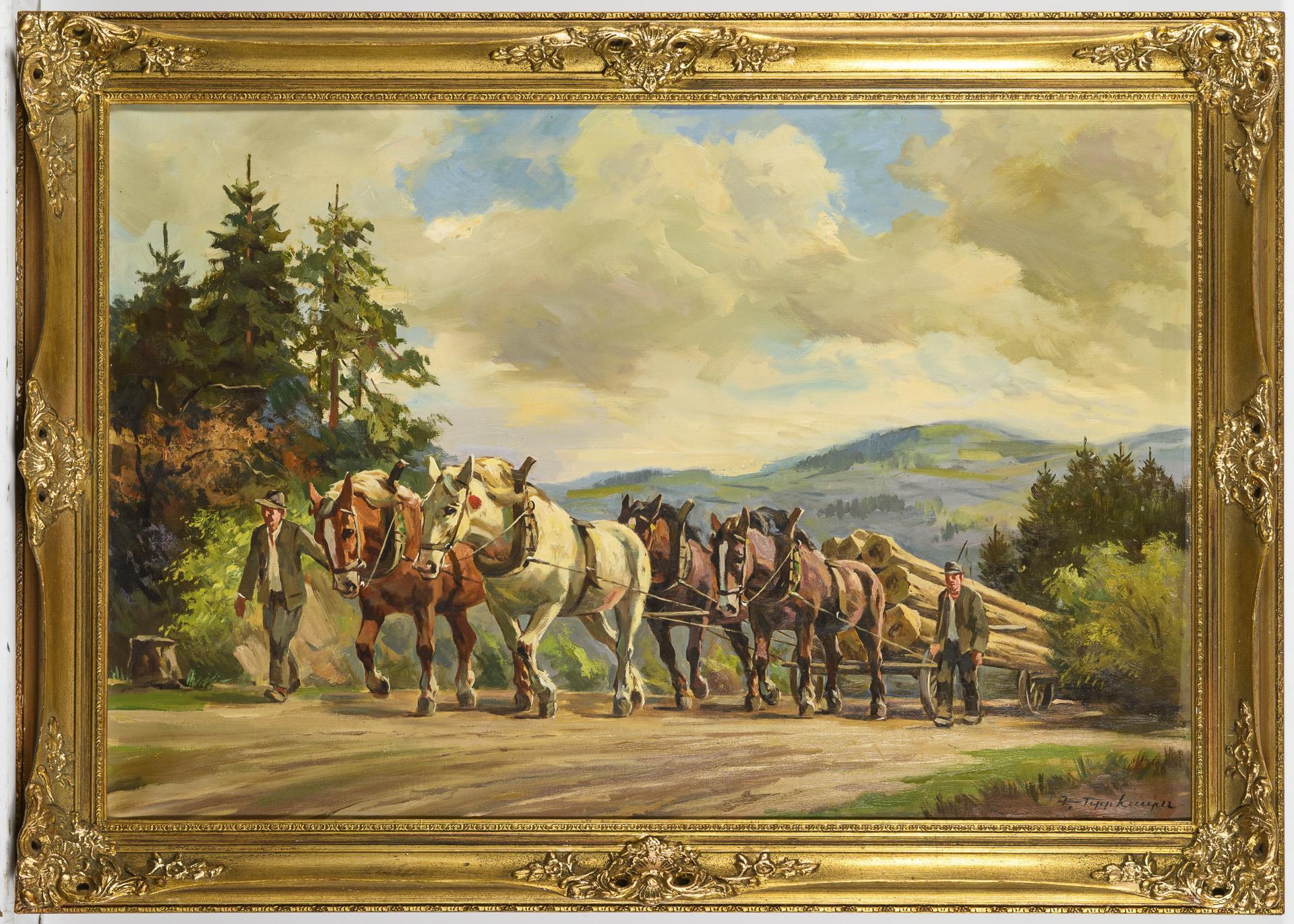 Undeutlich signiert: Holzarbeiter im Sonnenschein