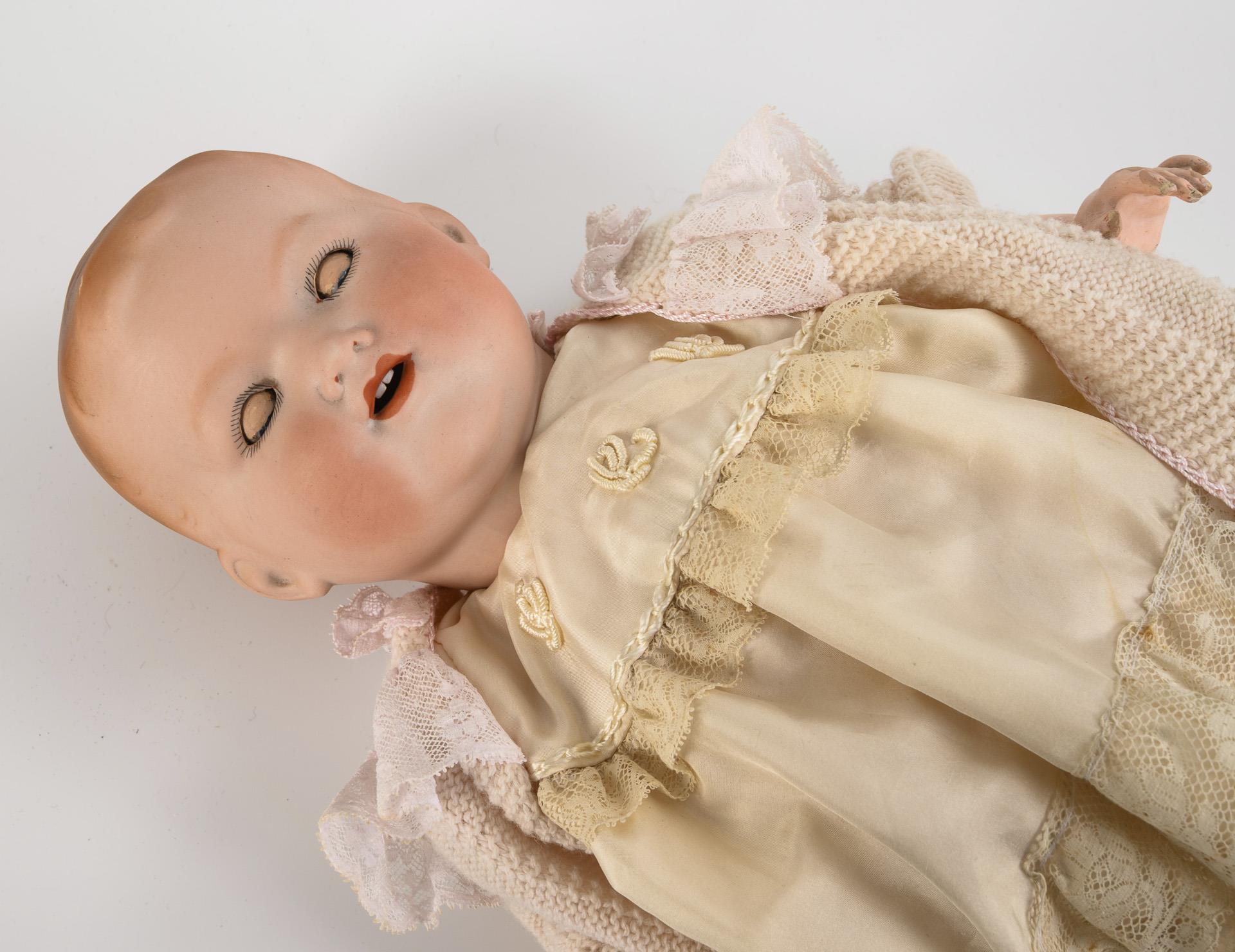 Kurbelkopf, blaue Schlafaugen, modellierte Haare. 5-teiliger Sitzbabykörper. Weißes Seidenkleidchen, rosa Strickjacke. Je 1 winziger Chips am rechten Auge und an der Halskurbel.