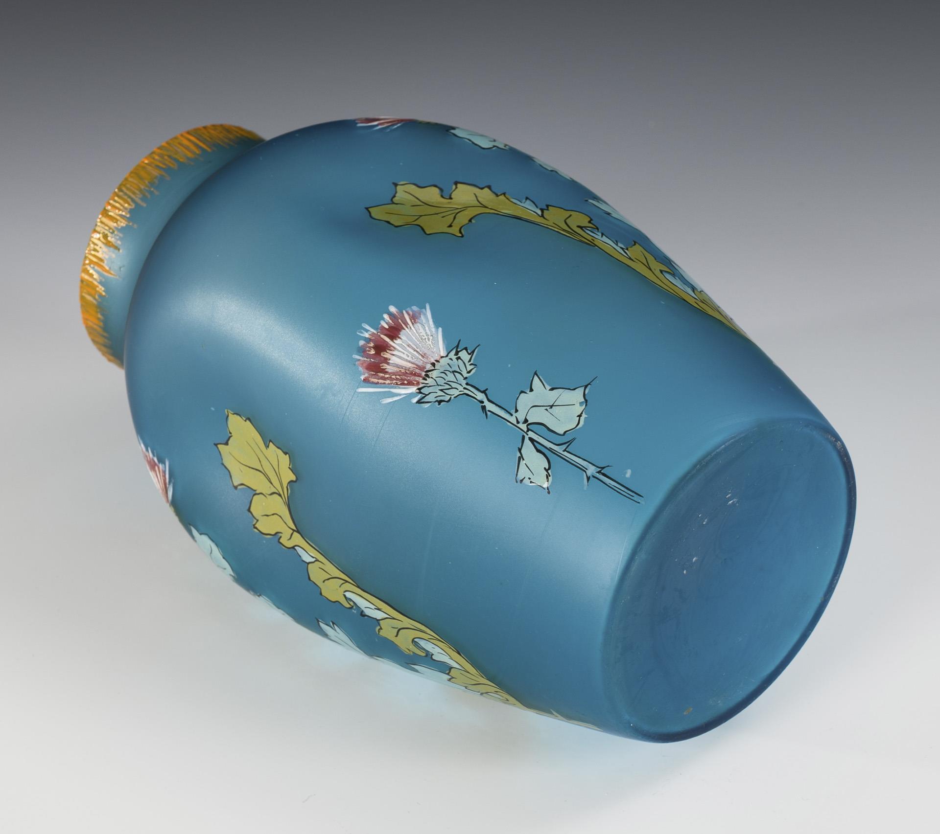 Hellblaues, satiniertes Glas, polychrome Emailmalerei. H 19,5 cm.