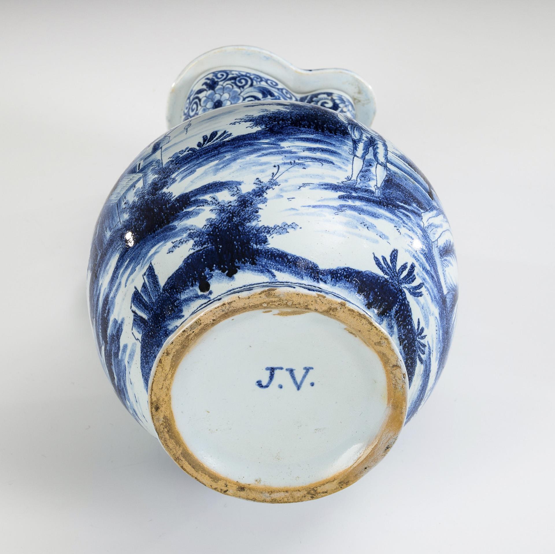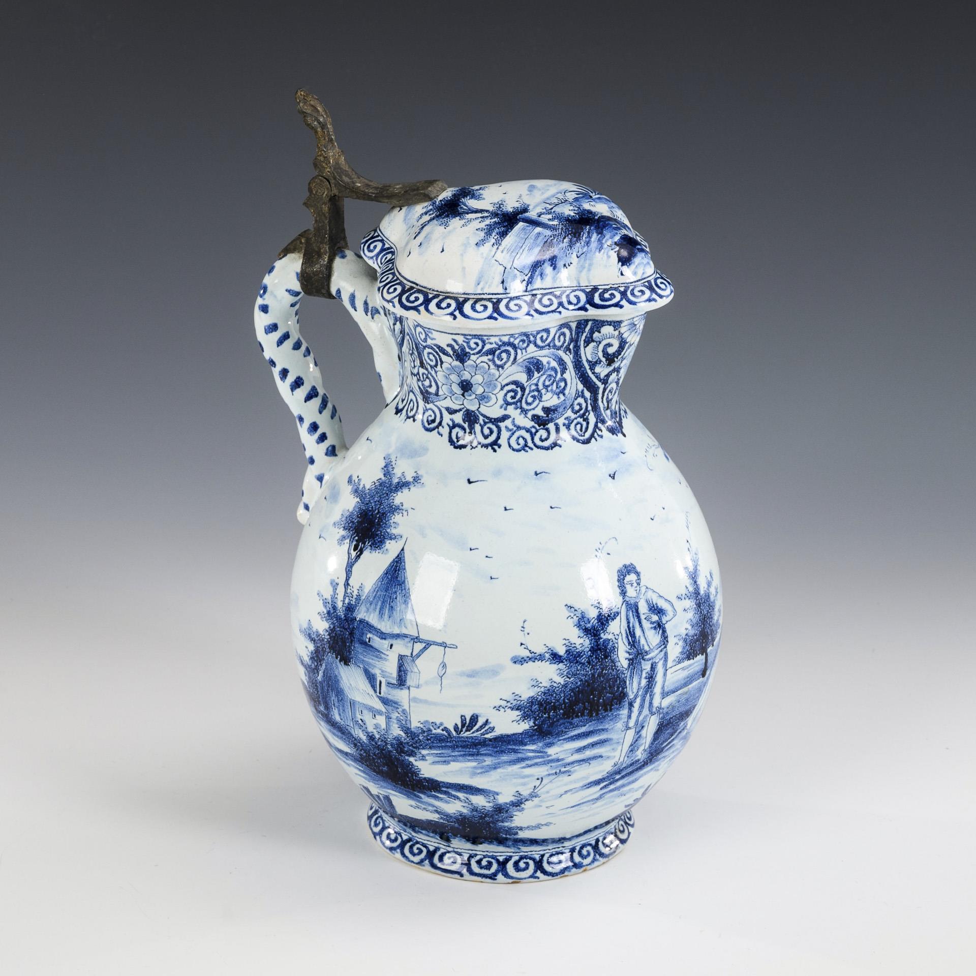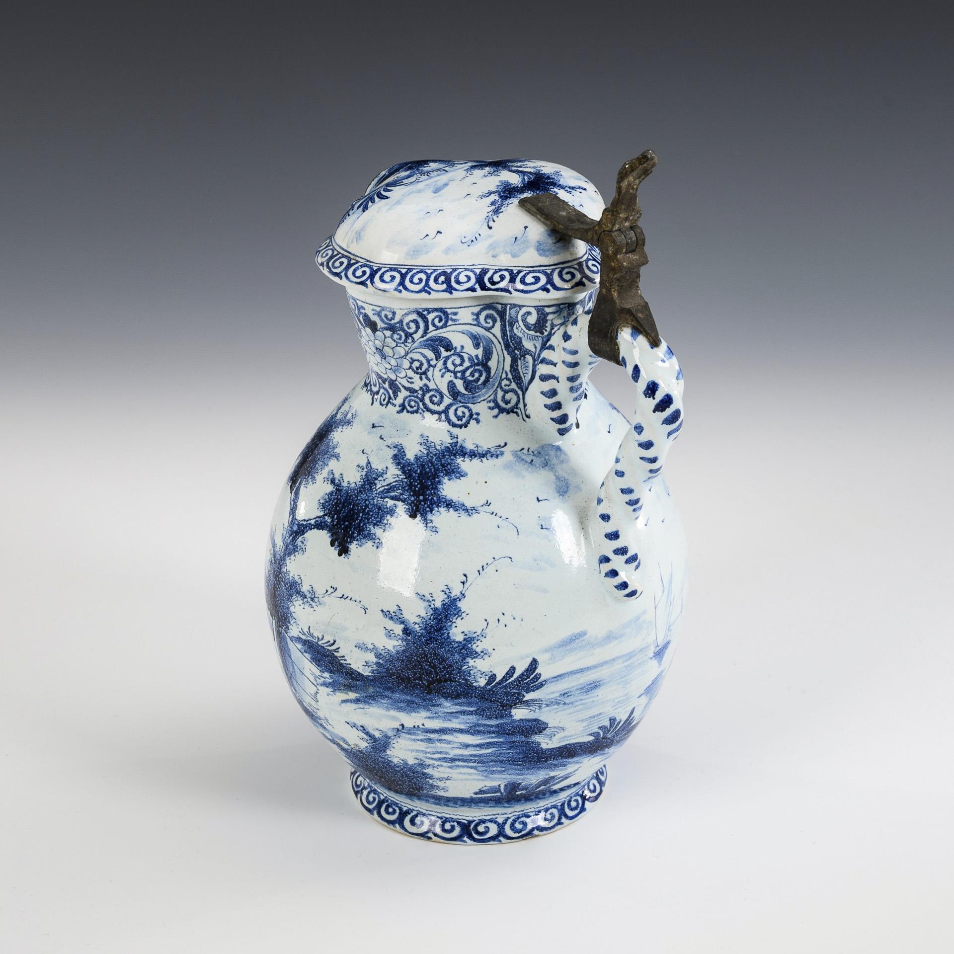 Bauchiger Korpus mit vierpassigem Hals und Mündung, gedrehtem Henkel, auf flachem Rundfuß. Umlaufend bemalt mit einem barocken Liebespaar in Landschaft mit Architektur und Segelbooten. Zinnmontierung mit Muscheldrücker. Restauriert an Hals, Mündung, Deckel und Standfläche.