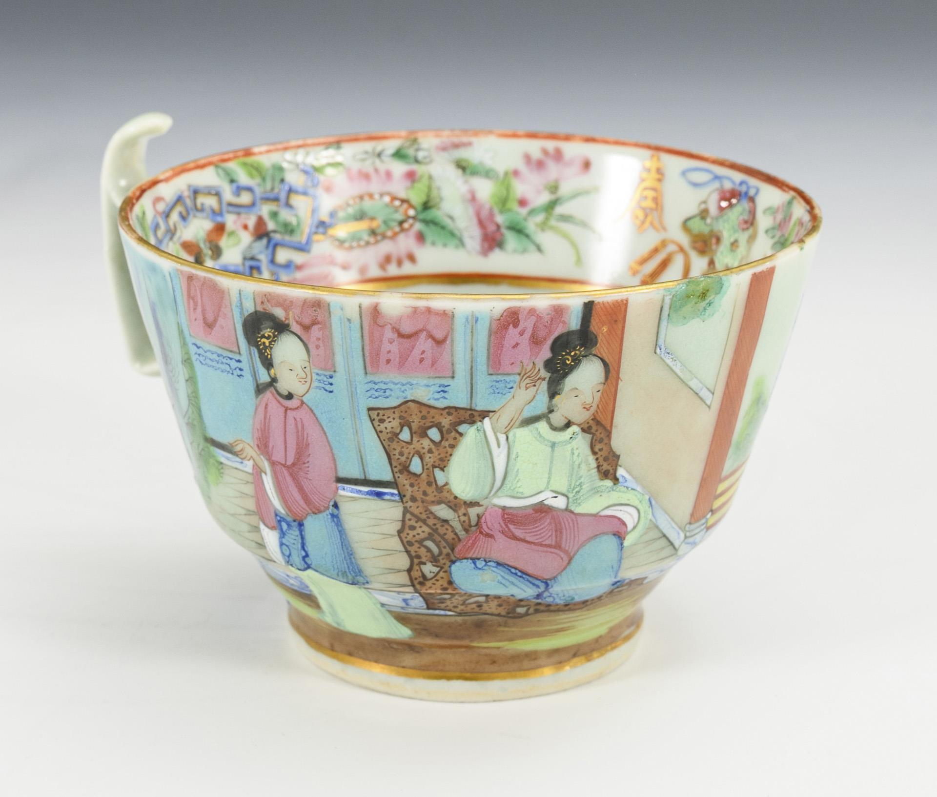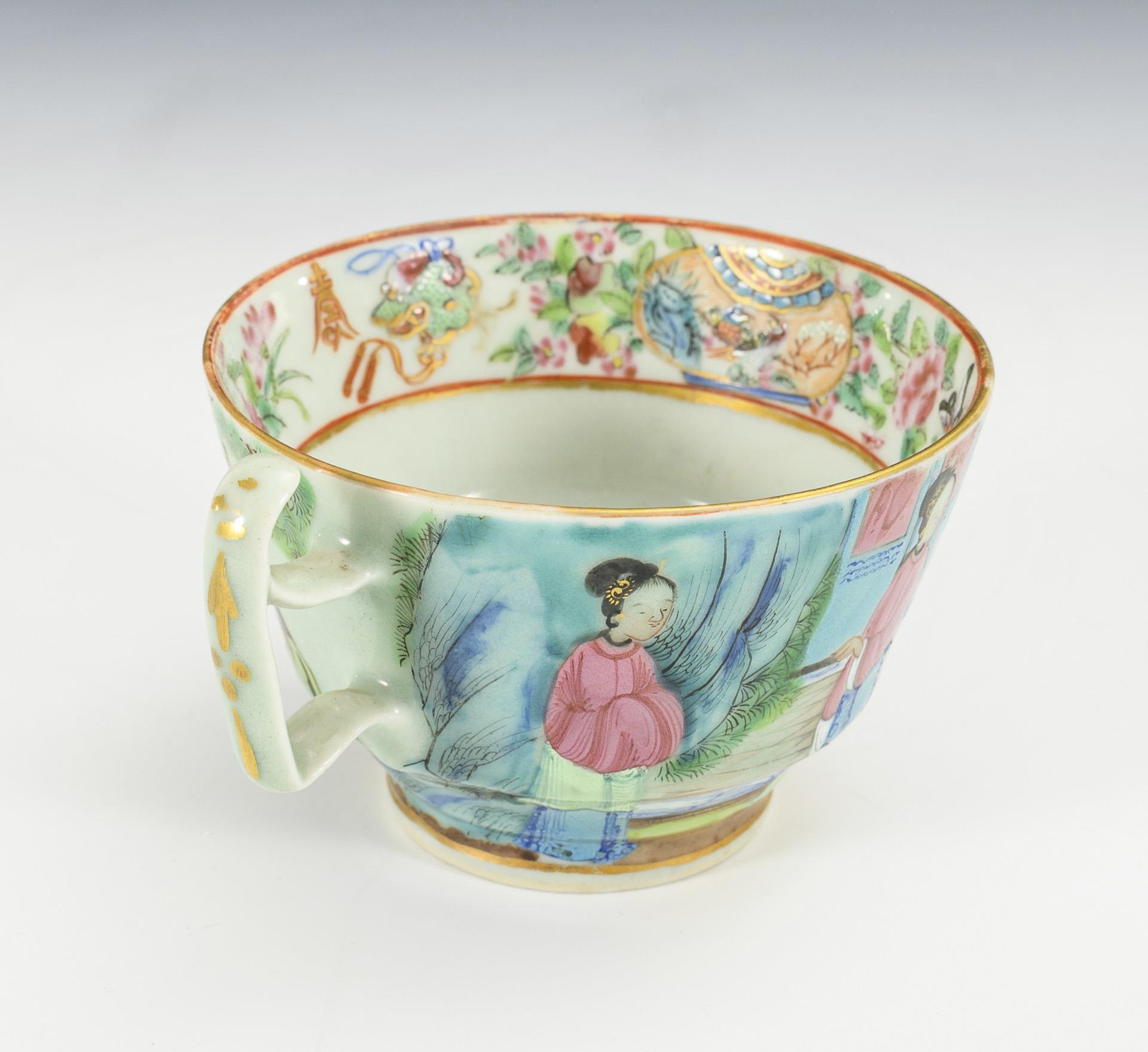 Feine figürliche und florale Bemalung auf graugrüner Grundglasur. Tasse mit ausgefallener Henkelform. Tasse mit retuschiertem Chip.