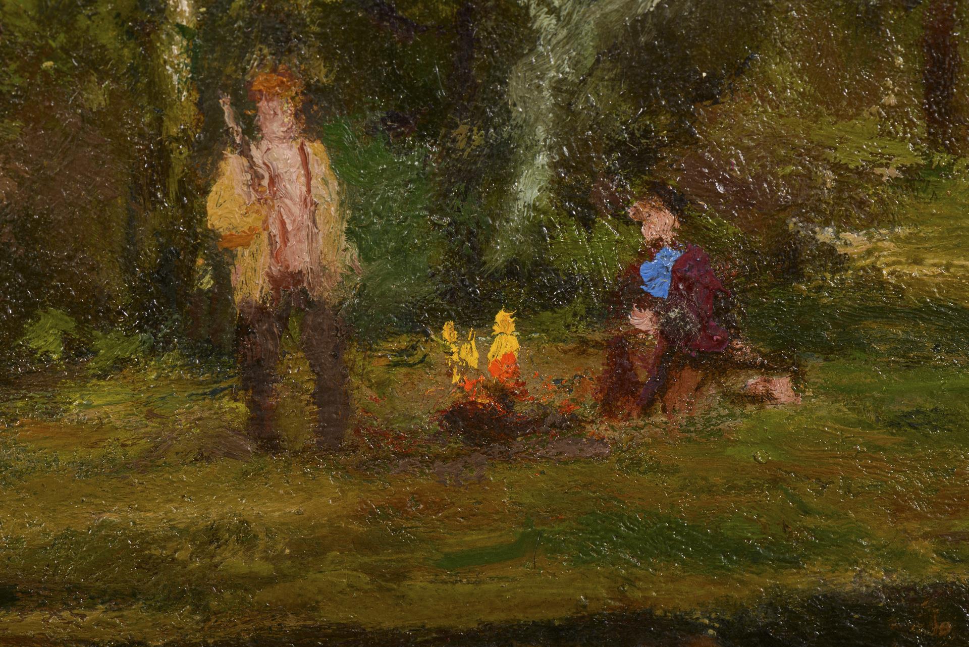 Personen an einem Lagerfeuer mit der Viehherde am Waldrand. Bestoßene Ecken.