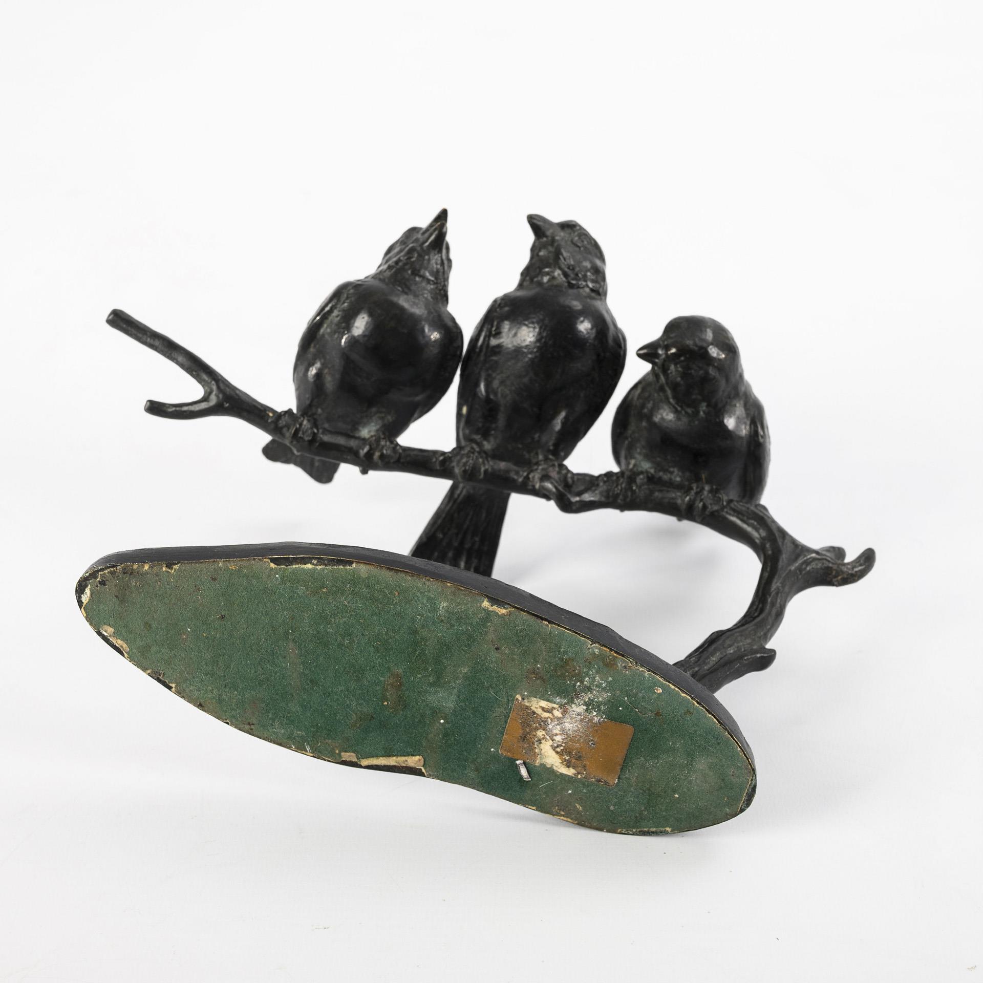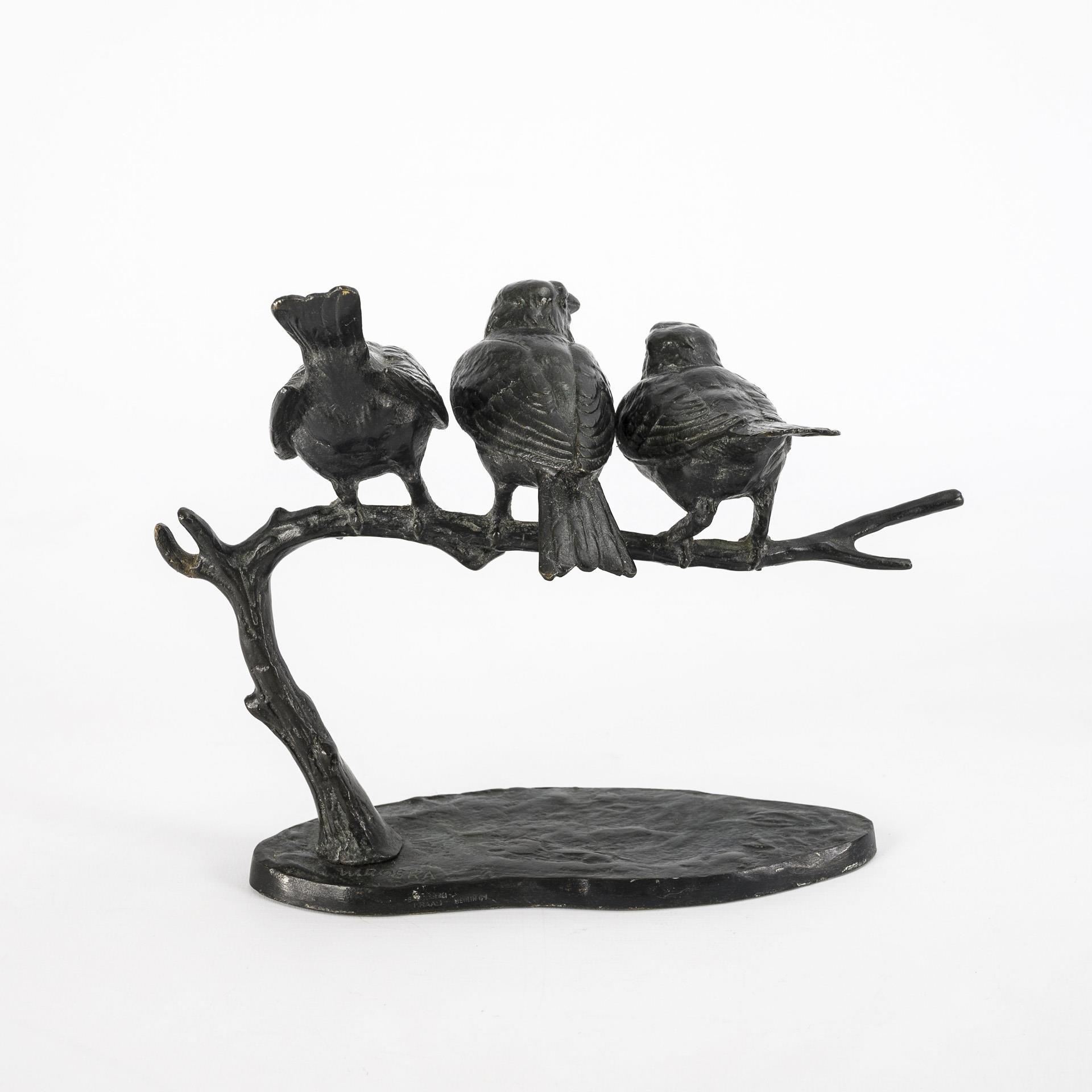 Über annähernd ovaler Bronzeplinthe auf einem Ast sitzende Vögel in unterschiedlichen Posen. Leichte Alters- und Gebrauchsspuren.