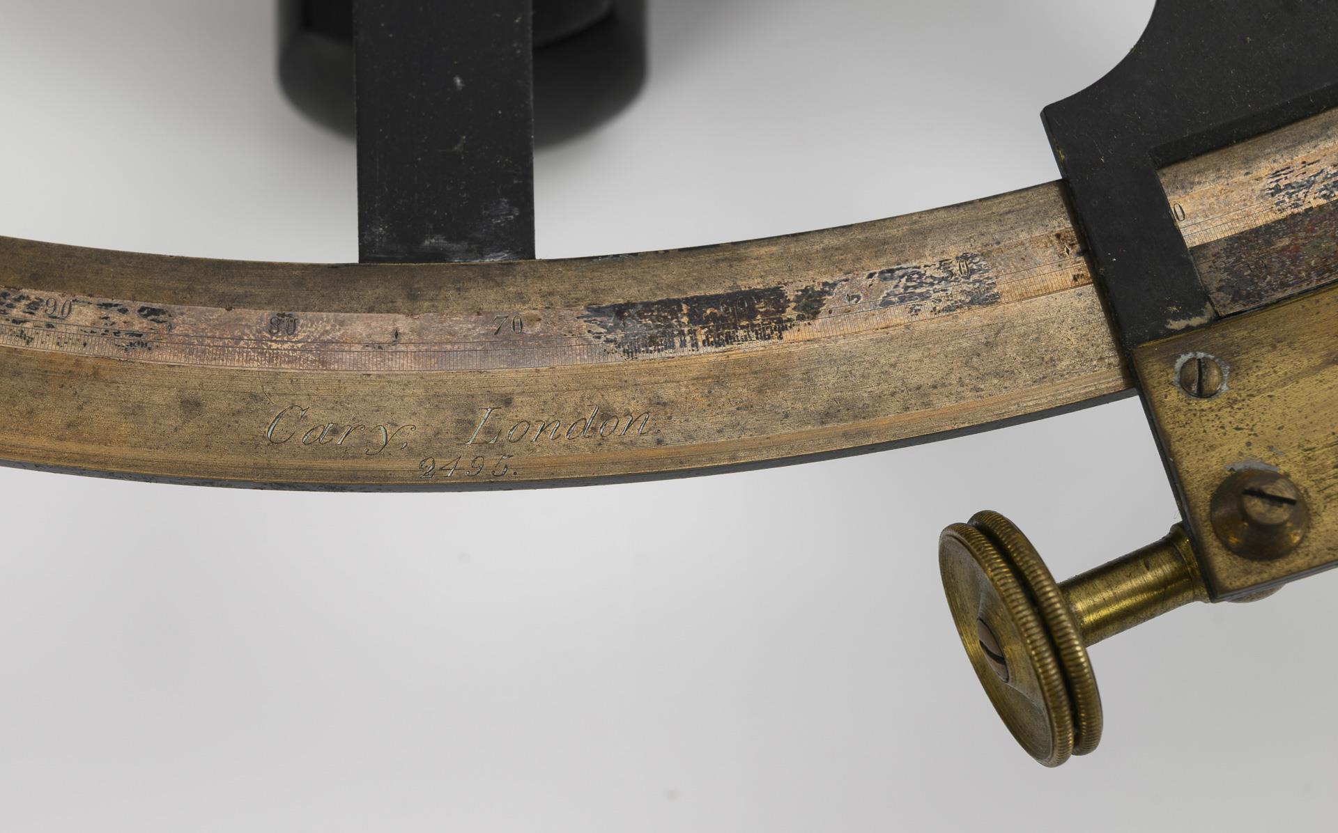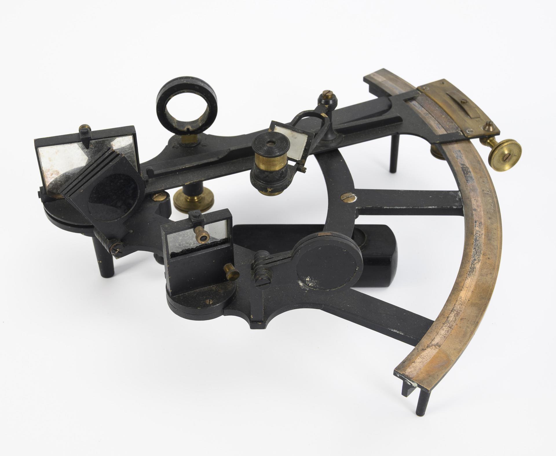 Sextant in zugehöriger Holzschatulle, beiliegend weiteres Zubehör. Sextant mit "Carey London" gemarkt. Alters- und Gebrauchsspuren; durchgehender Riss durch den Deckel, Schlüssel fehlt. Funktion des Sextanten nicht geprüft, deutliche Gebrauchsspuren sowie ein Ausbruch an den Glas-Komponenten, Zusatzokular mit Oxydationsspuren.