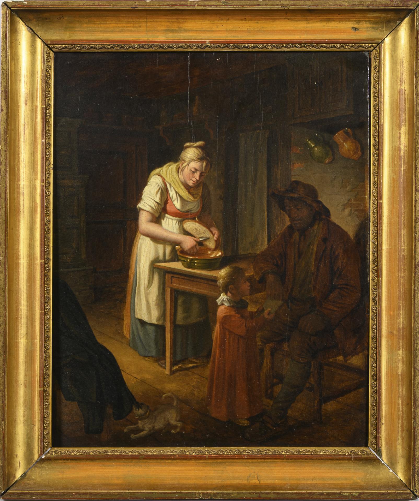Genreszene mit Bauernstube und kleiner Familie am Küchentisch. Altersspuren.