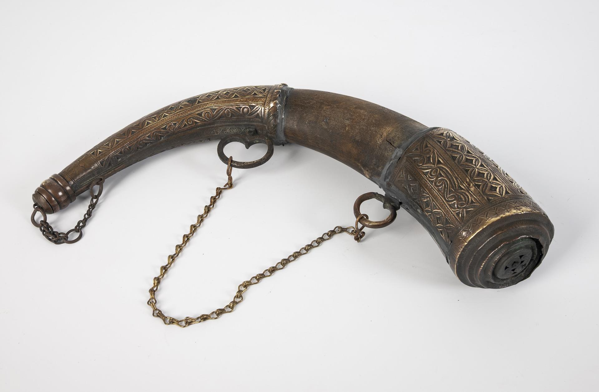 Rinderhorn mit reliefierten Messingbeschlägen und Trageösen. Am breiteren Ende teils durchbrochen gearbeitet. Verschluss lässt sich nicht öffnen.