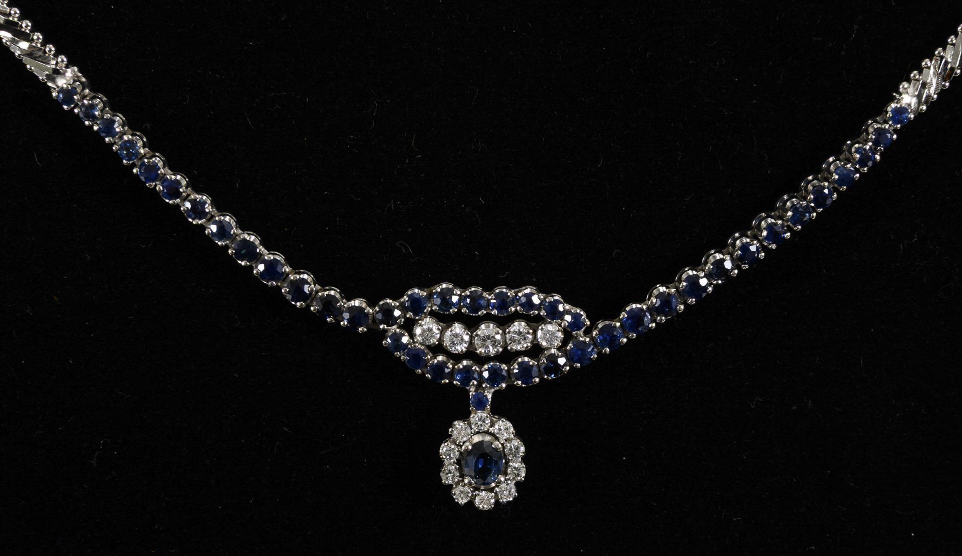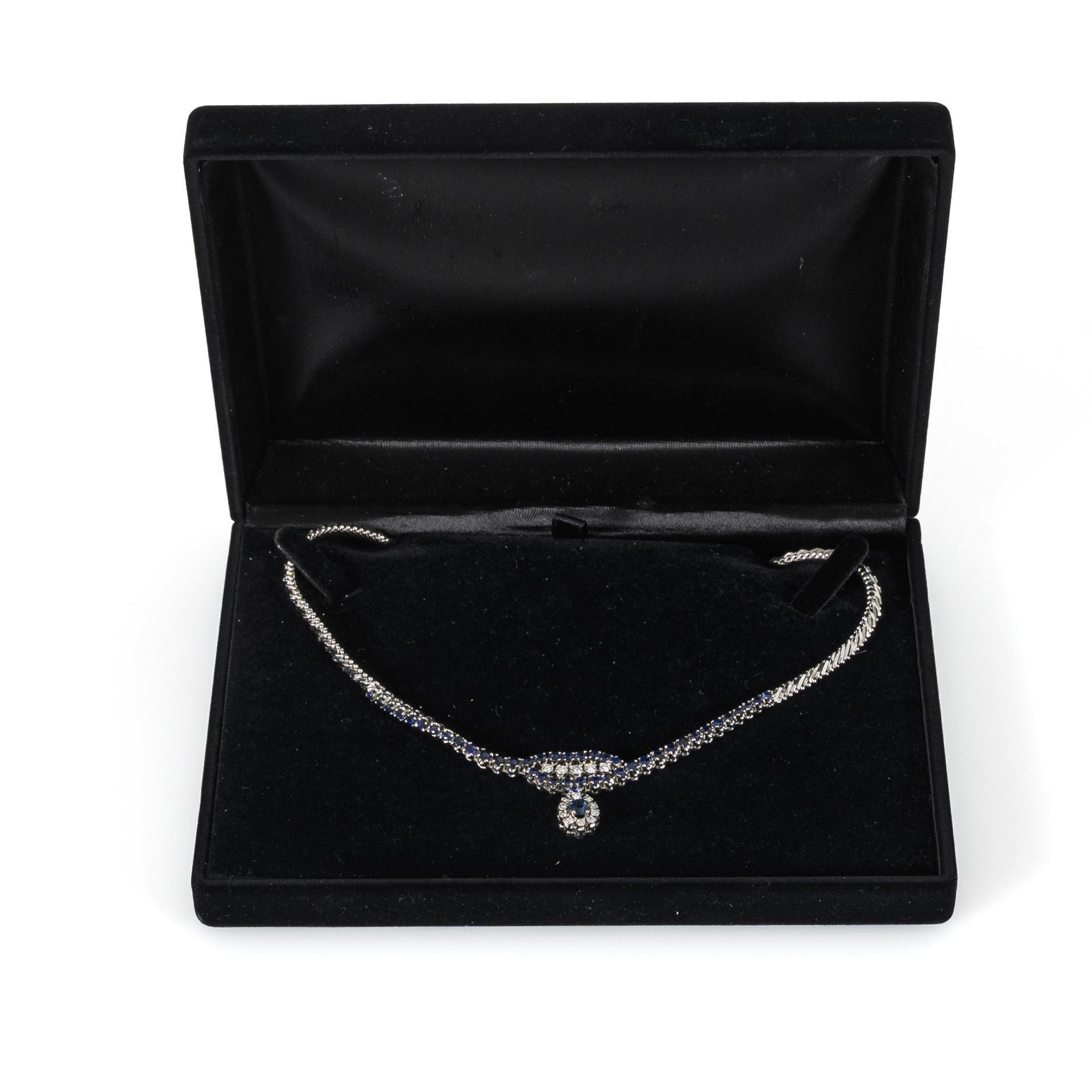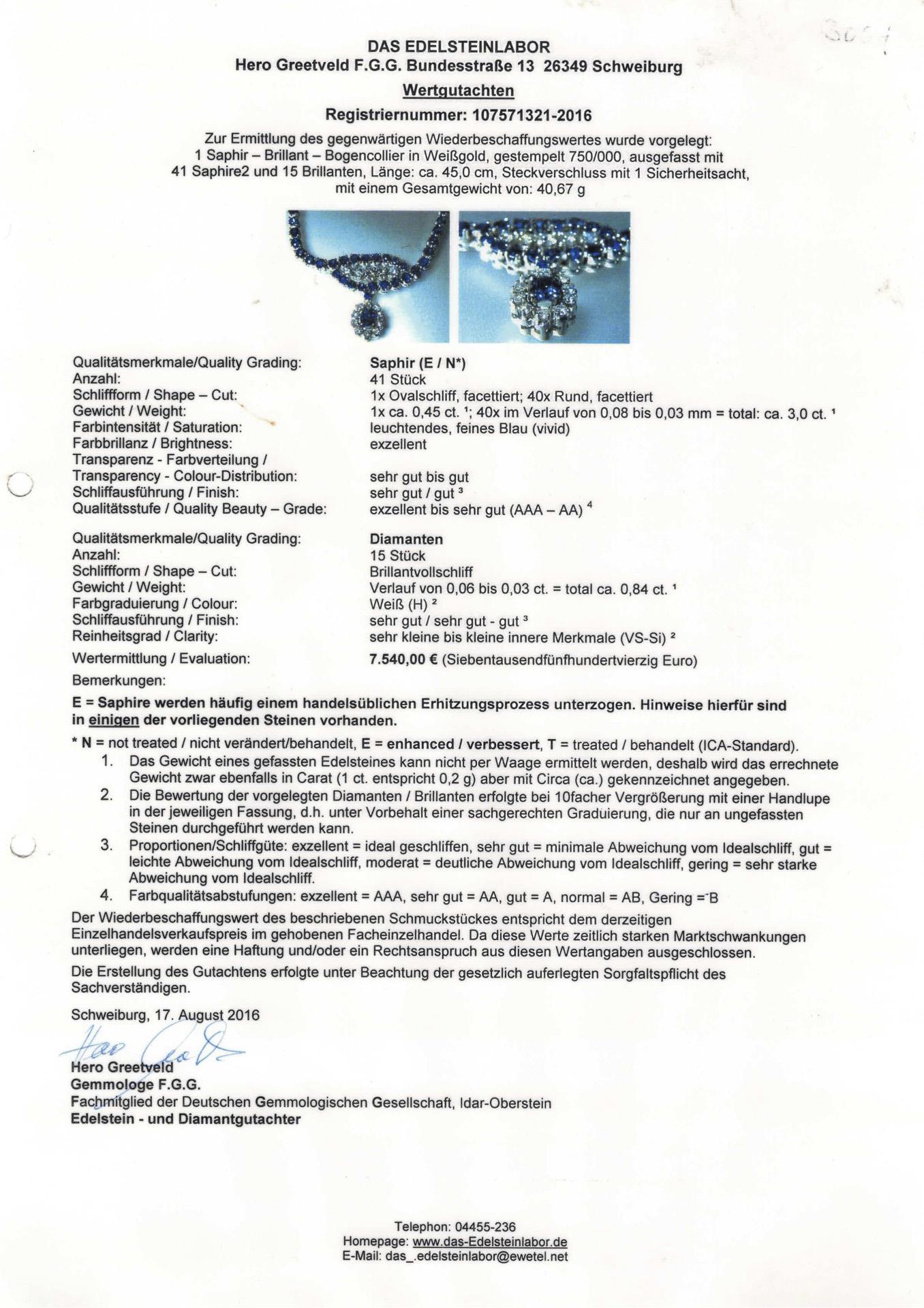 Bogencollier, ausgefasst mit 41 Saphiren und 15 Brillanten, mit einer als Entourage-Element gestalteten Abhängung. Das Kastenschloss mit einfacher Achtersicherung.