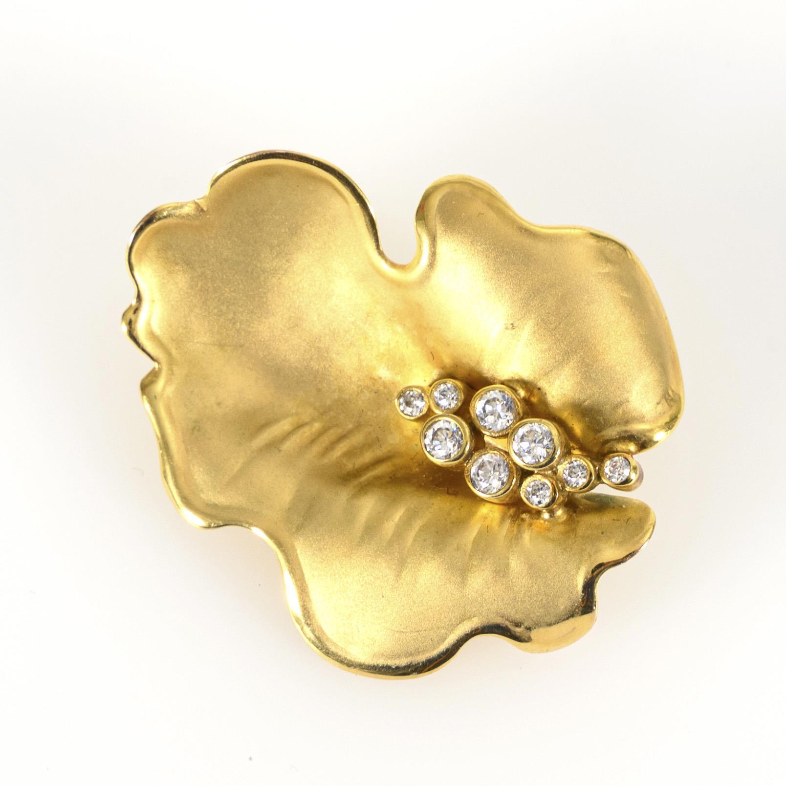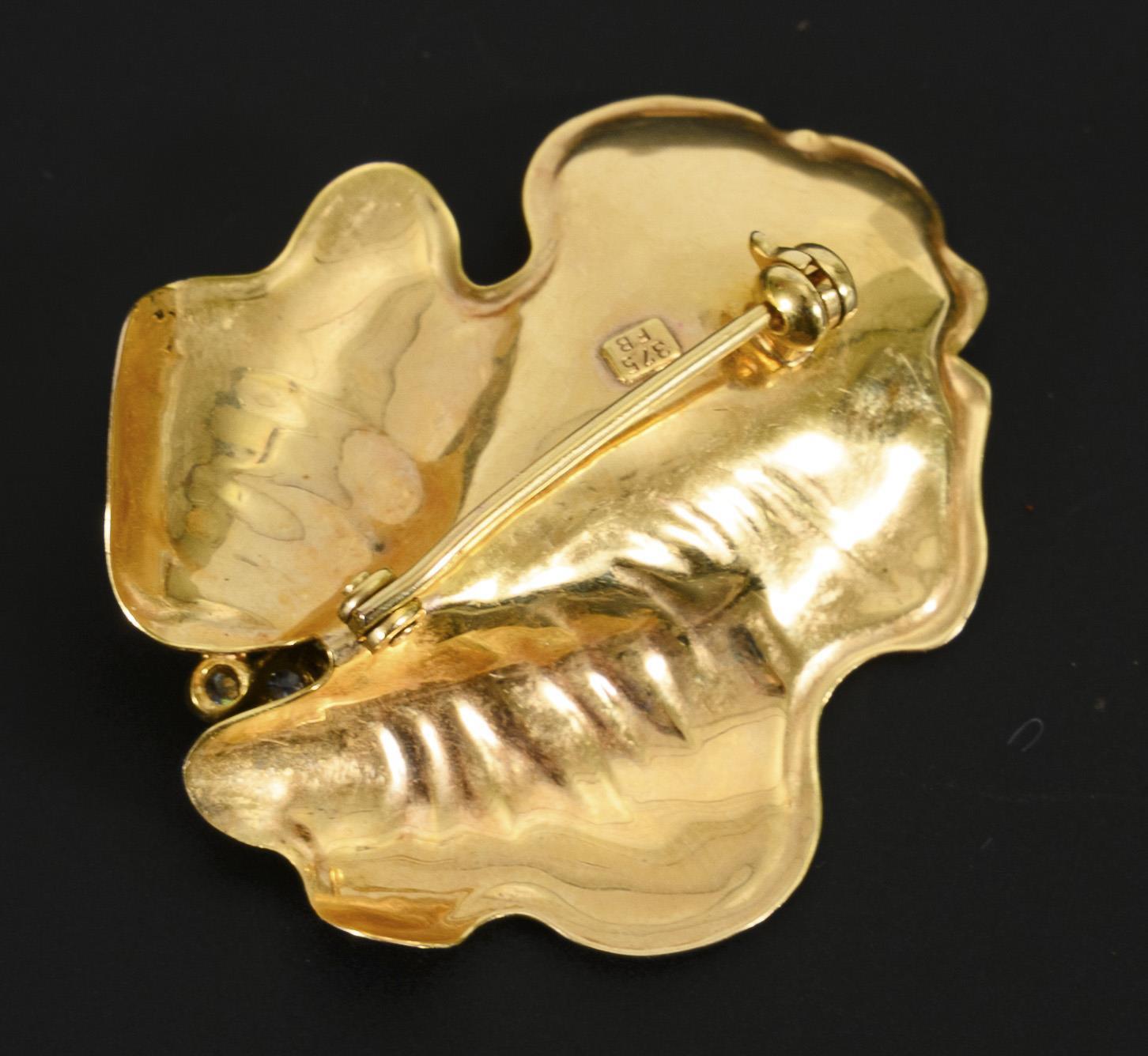Brosche in Form eines Blattes mit darauf aufgesetzten Zargenfassungen in verschiedenen Höhen, diese ausgefasst mit Brillant-Imitationen (wohl Glas). Kugelhakenverschluss.