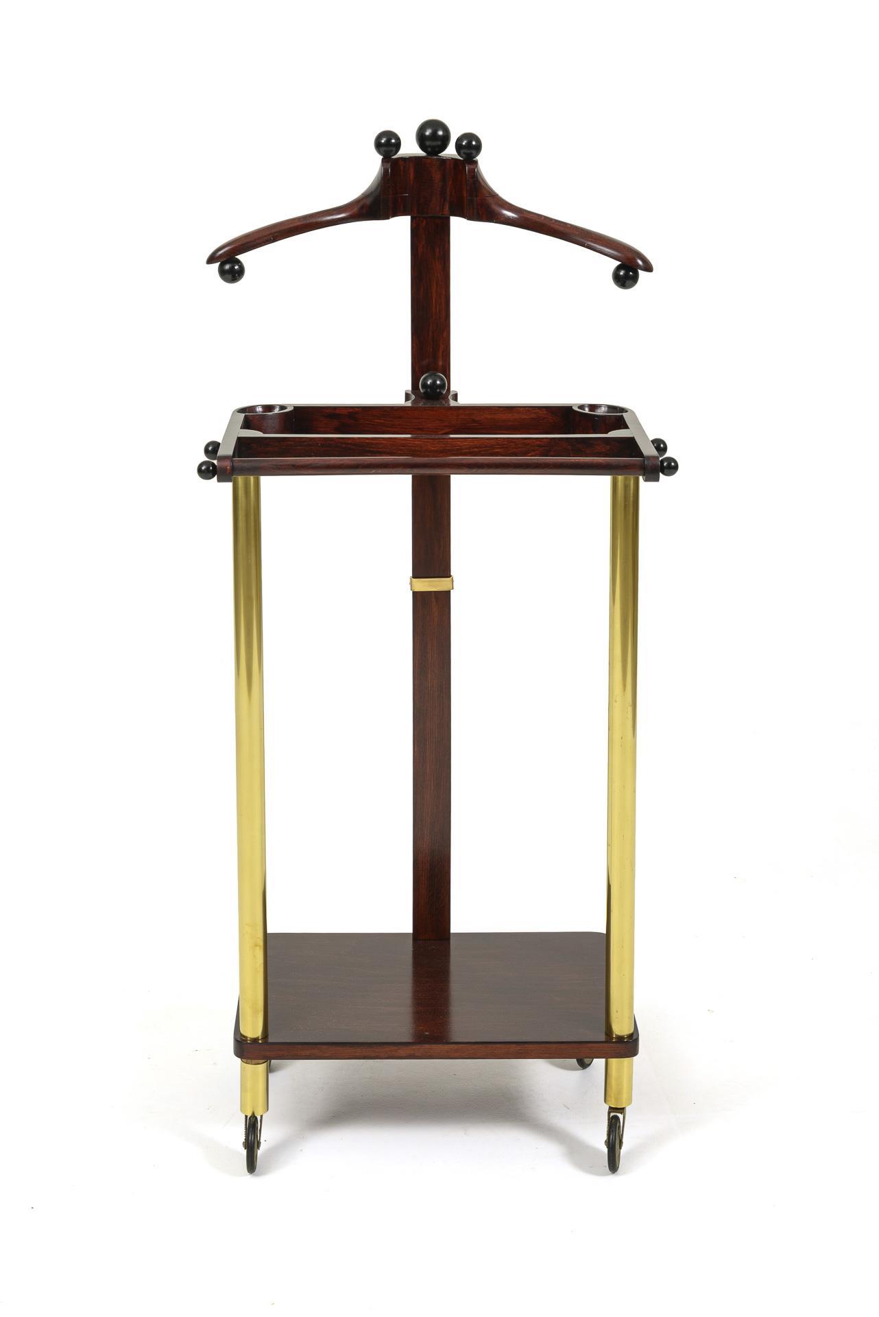 In Art der klassischen Bugholz-Art-déco-Möbel gefertigter, rollbarer Garderobenständer mit Kleiderbügel, vertiefter Ablagefläche mit 2 seitlichen Knopfablagen und einer Querstrebe, unten eine Schuhablage. Verziert mit Kugelknäufen und Messing.