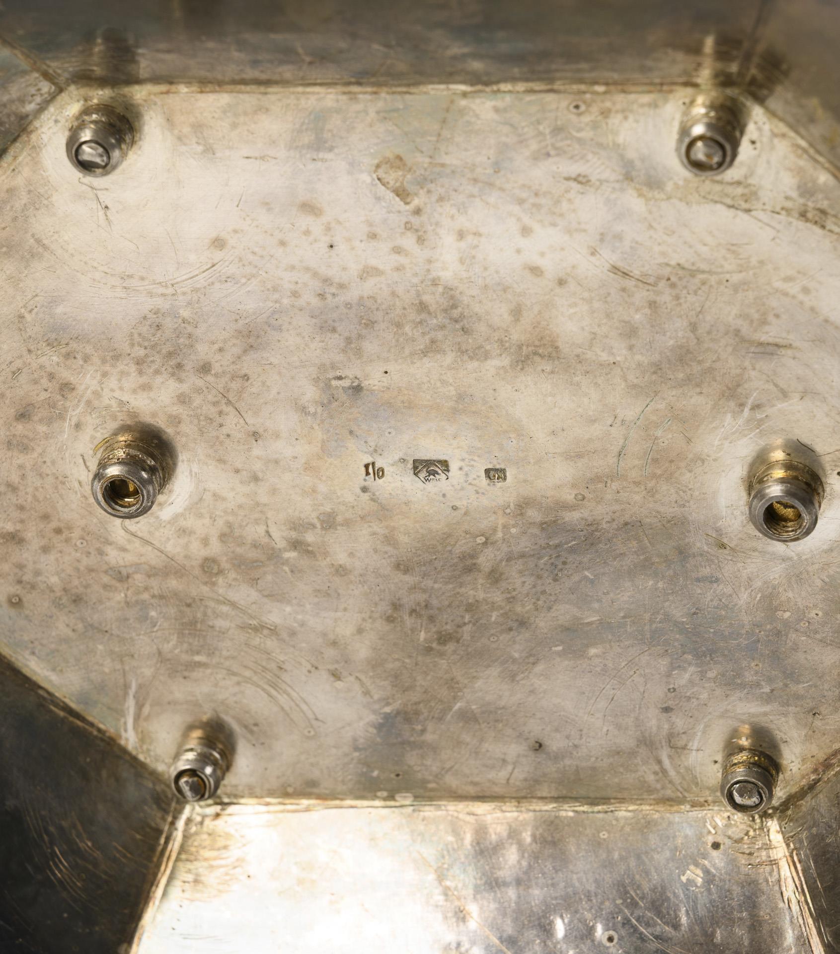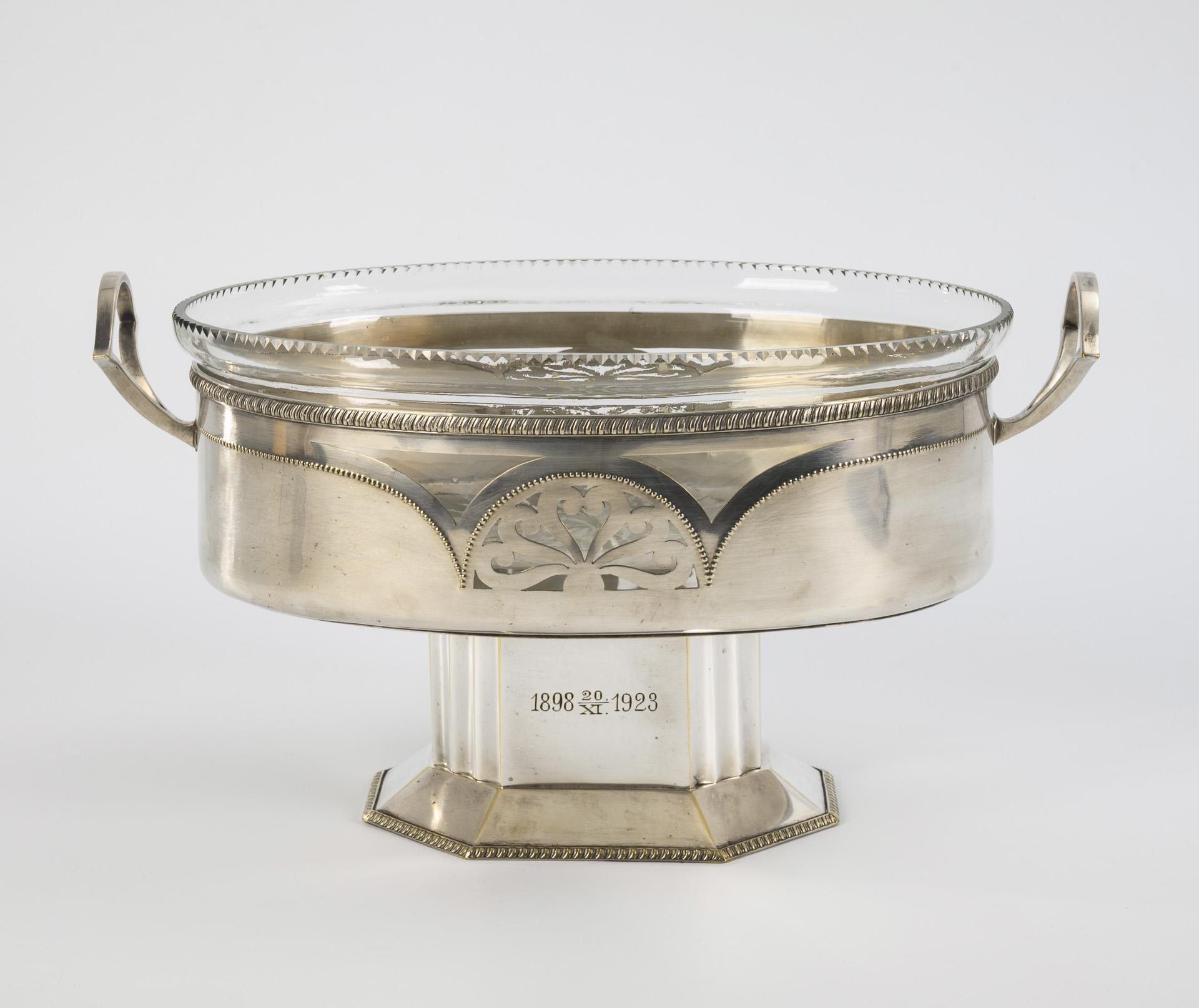 Metall versilbert, Glas. 22 x 39 x 23 cm. 3113 g.