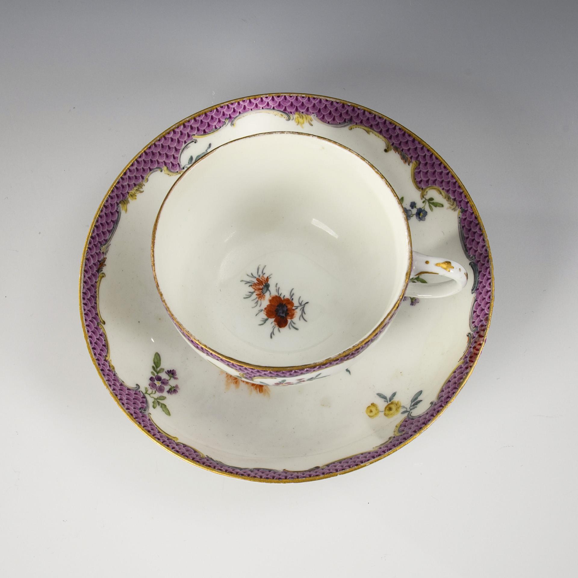 Bauchige Tasse mit Ohrenhenkel. Unter einer purpurfarbenen Schuppenbordüre die Darstellung von Blumenbuketts. Partiell minimaler Goldabrieb, Untertasse restauriert.