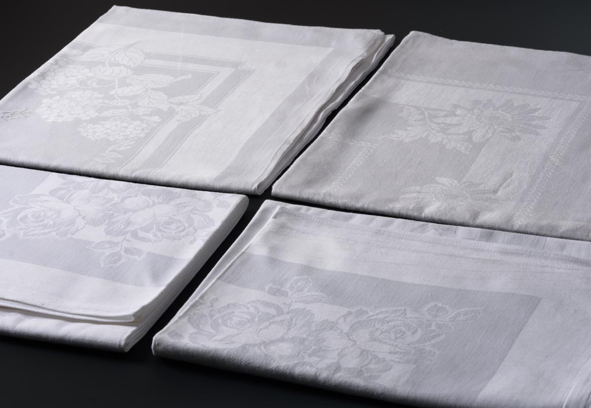 Paar Baumwolldamast-Tischtücher mit Rosenmuster 150 x 142 cm. / Halbleinendamast-Tischtuch mit großen Blütendolden an Zeigen; Monogramm EM 160 x 128 cm. / Leinendamast-Tischtuch mit großen Blüten; Monogramm BP 160 x 128 cm.
