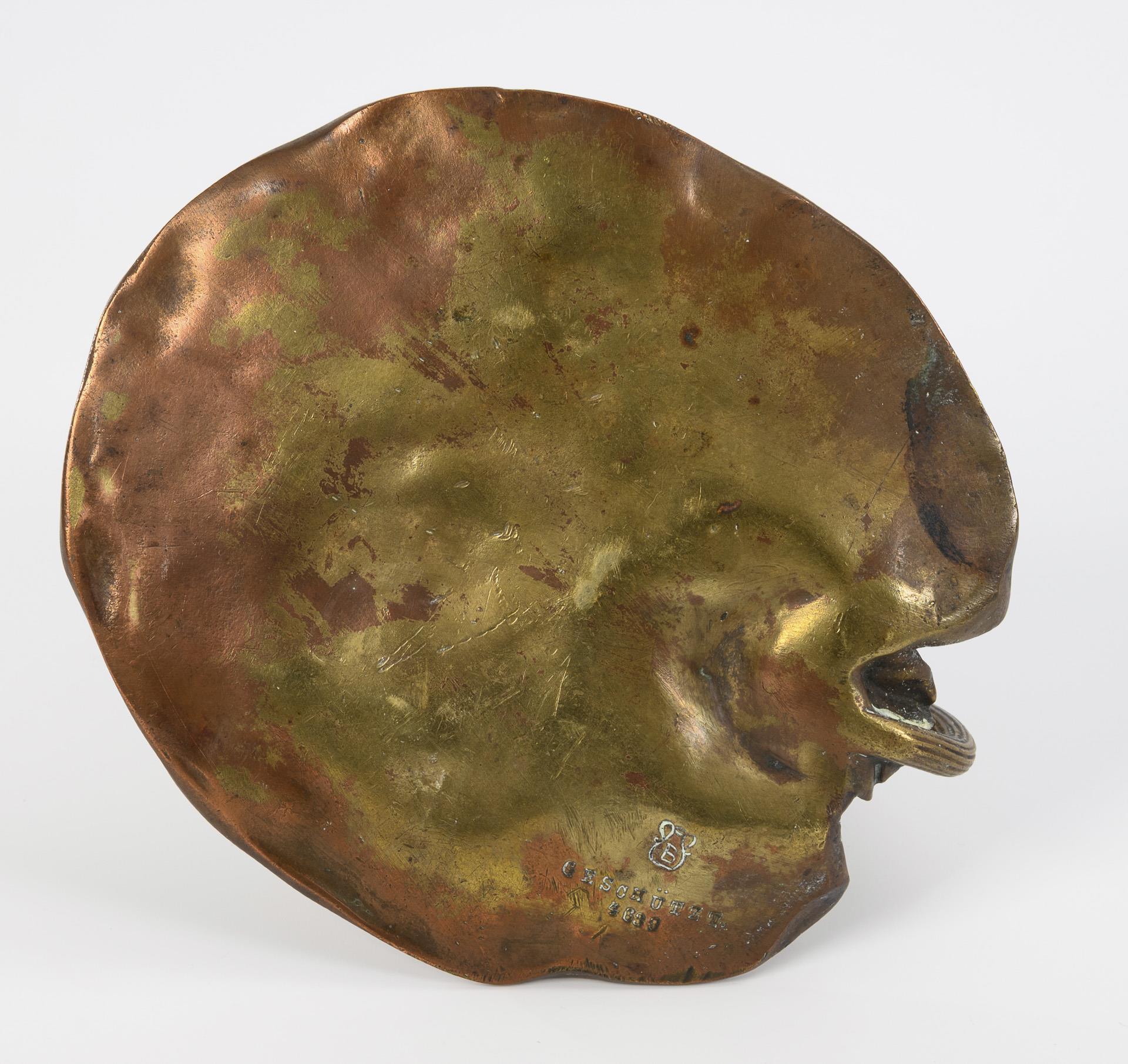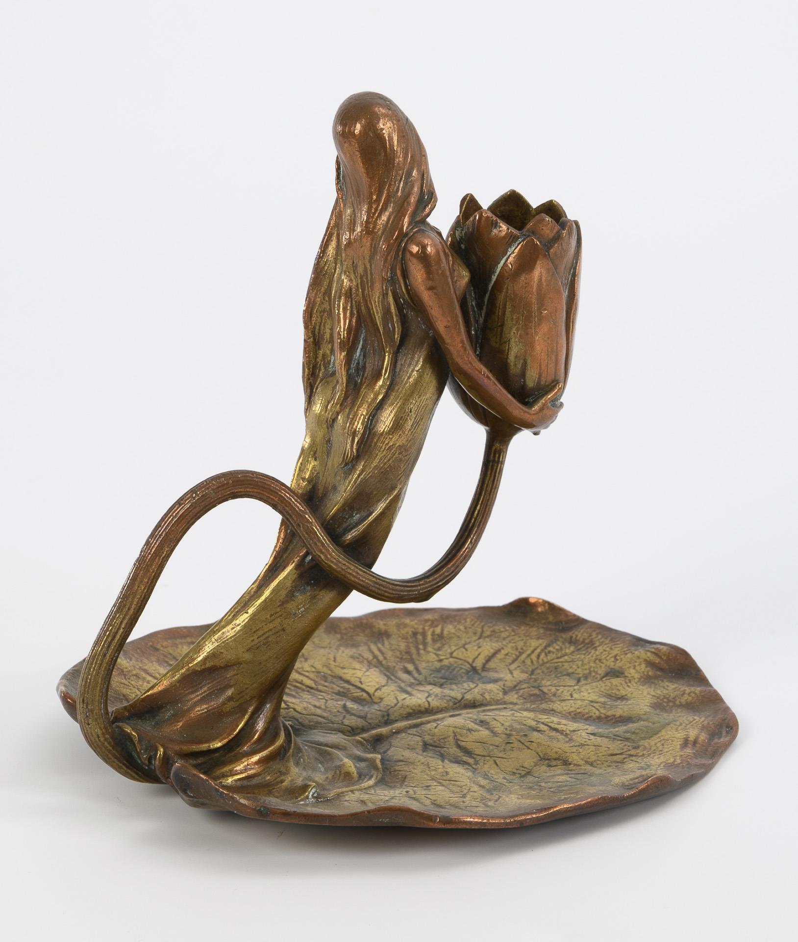 1-flammiger Leuchter in Form einer Mädchenfigur, auf einer Wasserlilie stehend, wobei die Blüte den Leuchterarm bildet und das Blatt als Tropfschale dient. Alters-/Gebrauchsspuren.