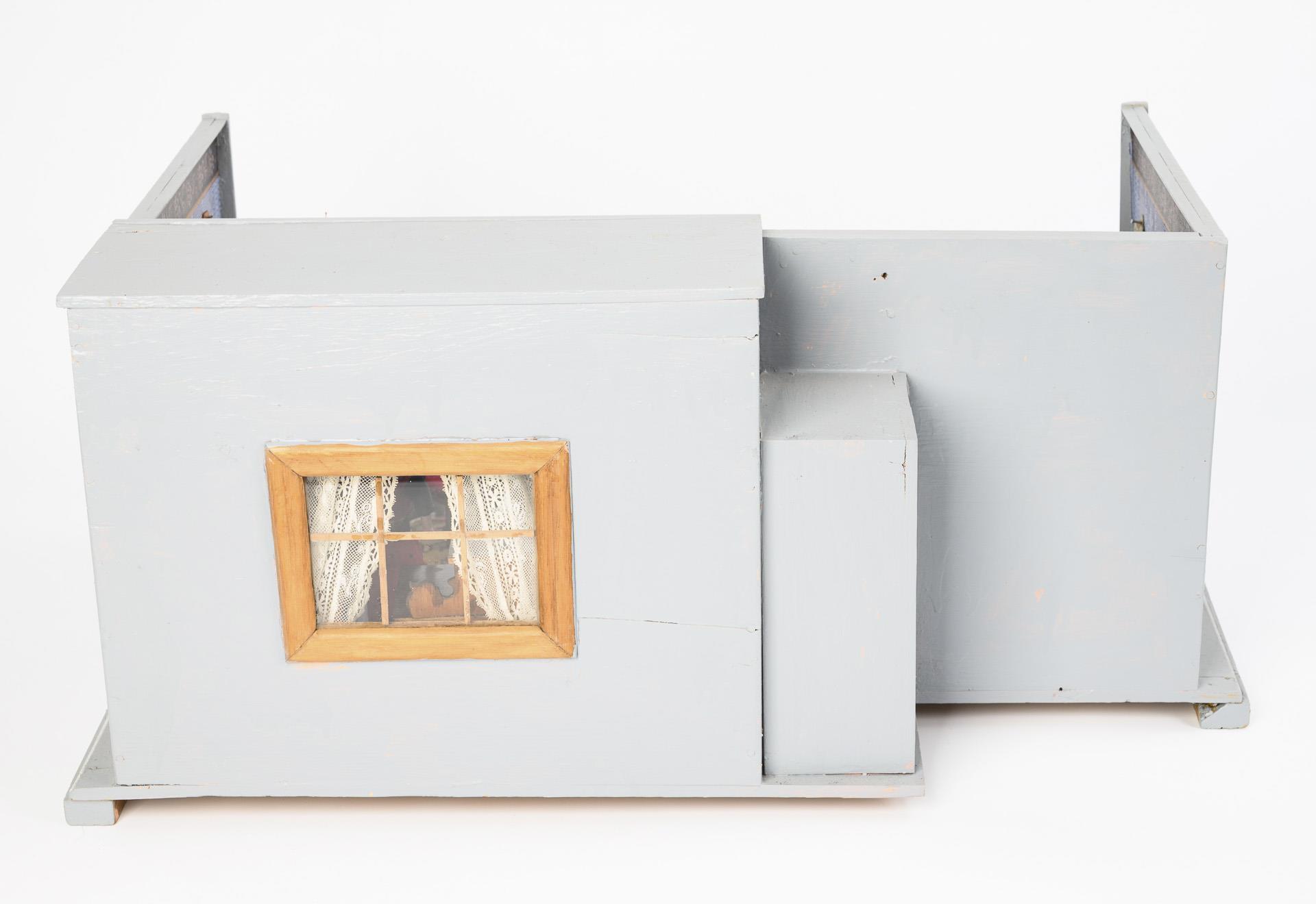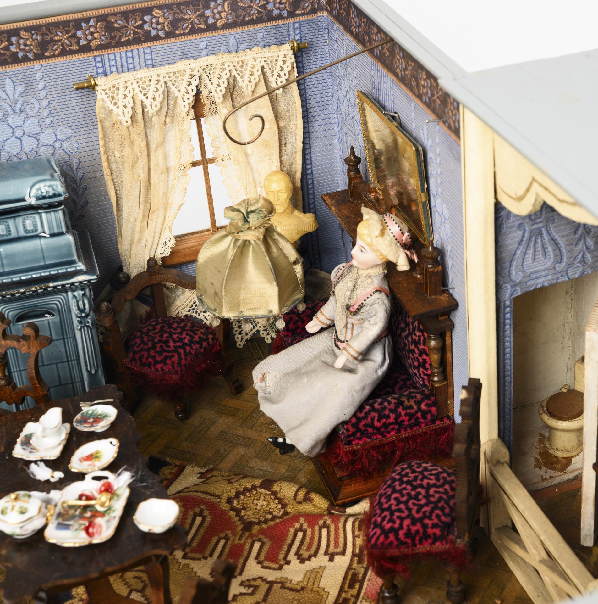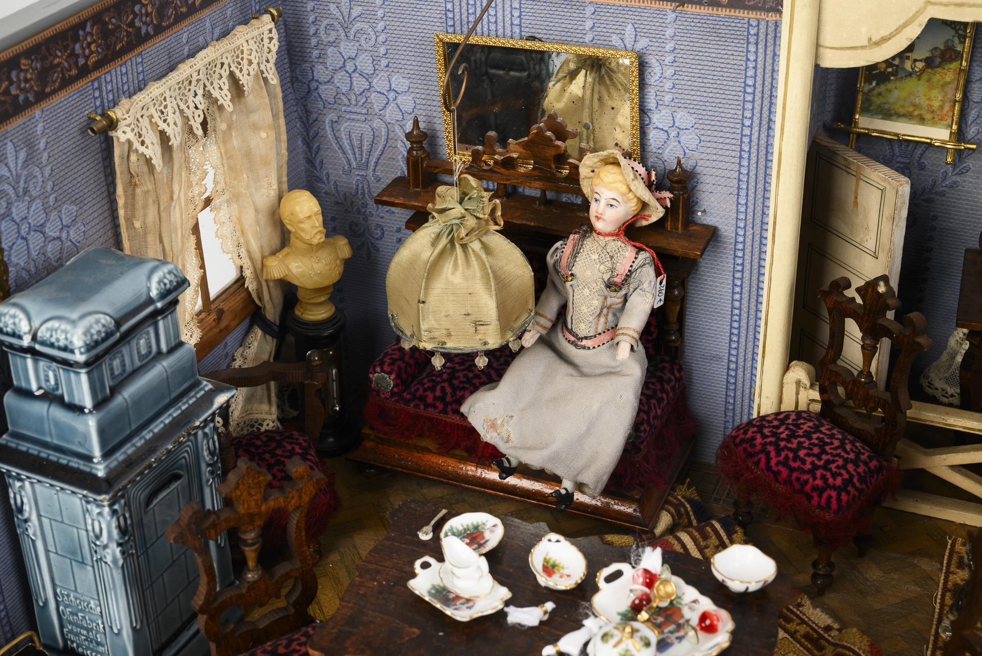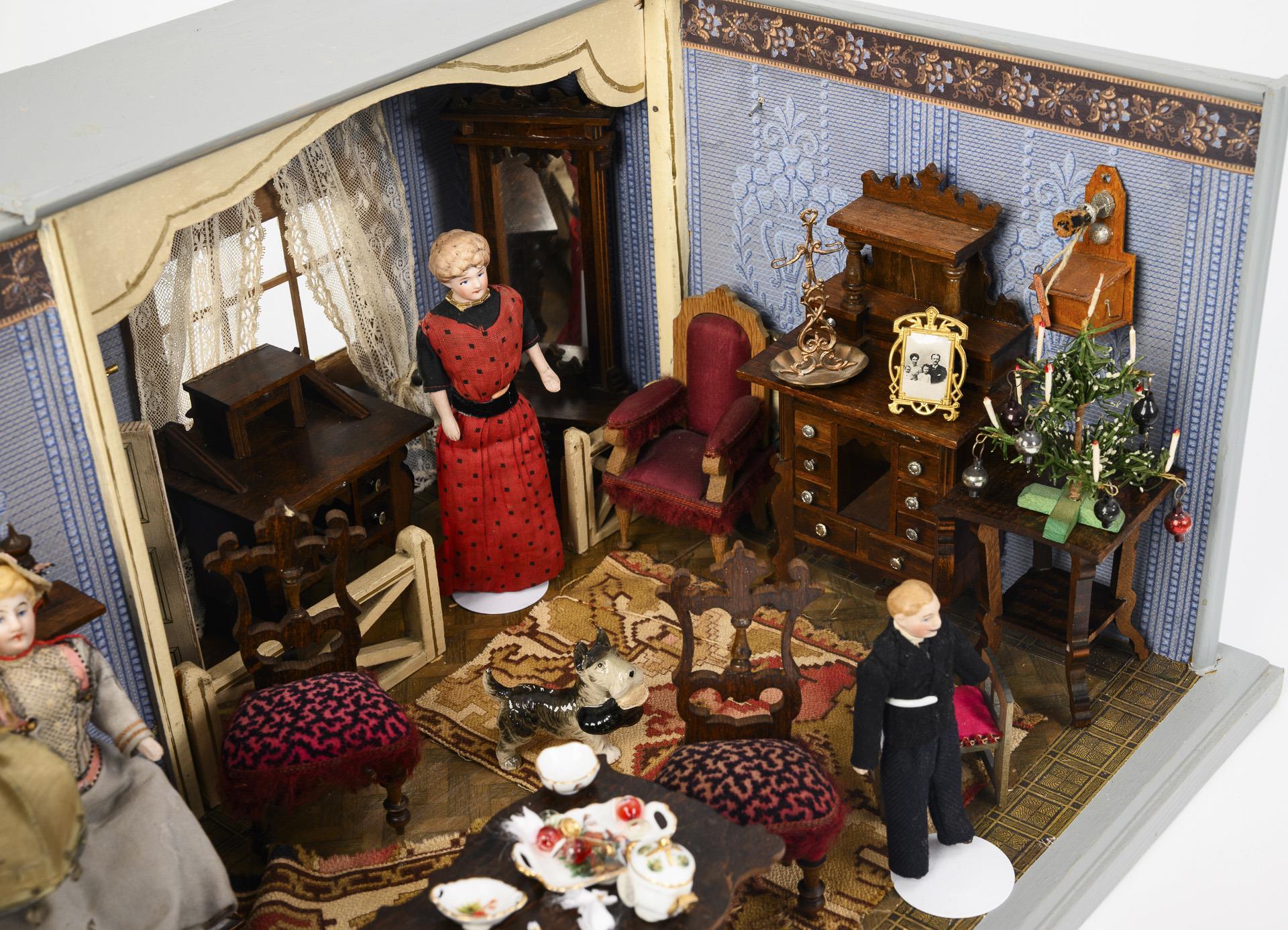1-Raum-Gehäuse mit 2 verglasten Fenstern, Gardinen, Teppichen und kleiner Toilette. Eingerichtet als Salon mit Kachelofen, Gründerzeit-Möbeln, Kaiser-Büste aus Celluloid, kleinem Weihnachtsbaum etc. Dazu 3 Püppchen. Altersspuren, kleine Defekte, Trockenriss im Boden.