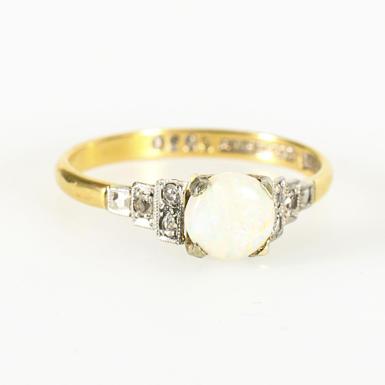 Ring aus der Zeit des Art déco mit einem runden Opal-Cabochon, die Ringschultern mit je 3 kleinen, in Platin gefassten Achtkant-Diamanten ausgestaltet. Unterseitig mit leichten Tragespuren.