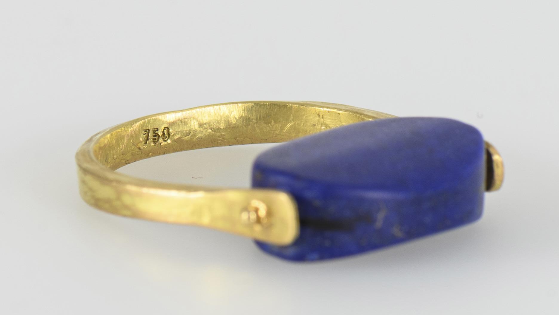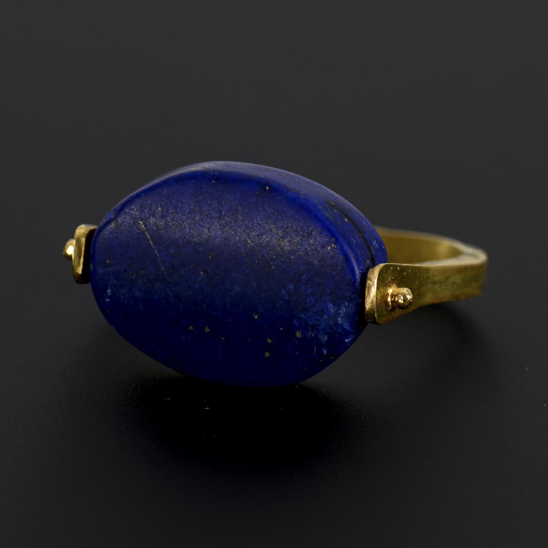 Unikater, antikisierend gestalteter Ring mit drehbarem Lapis Lazuli in Ovalform.