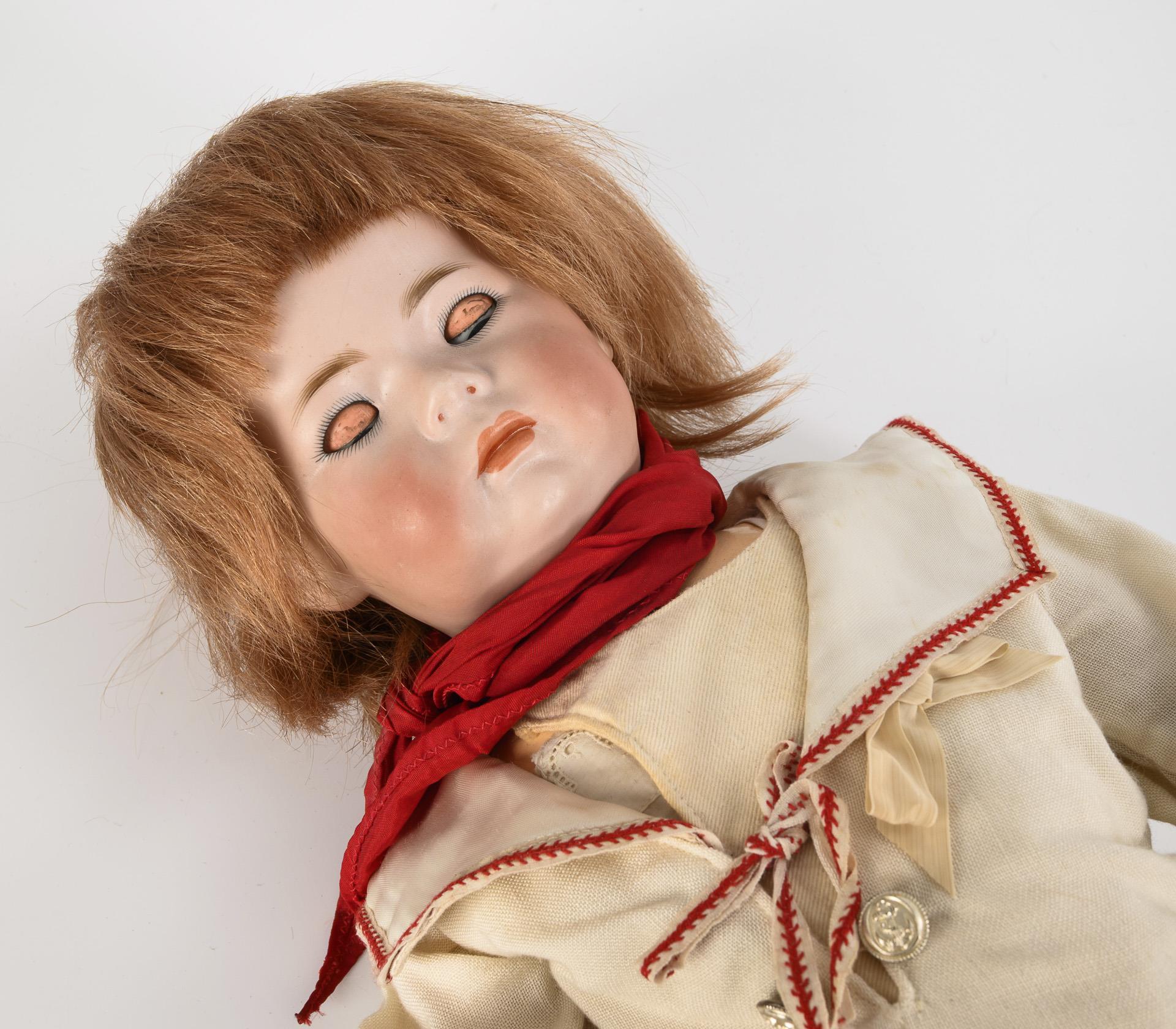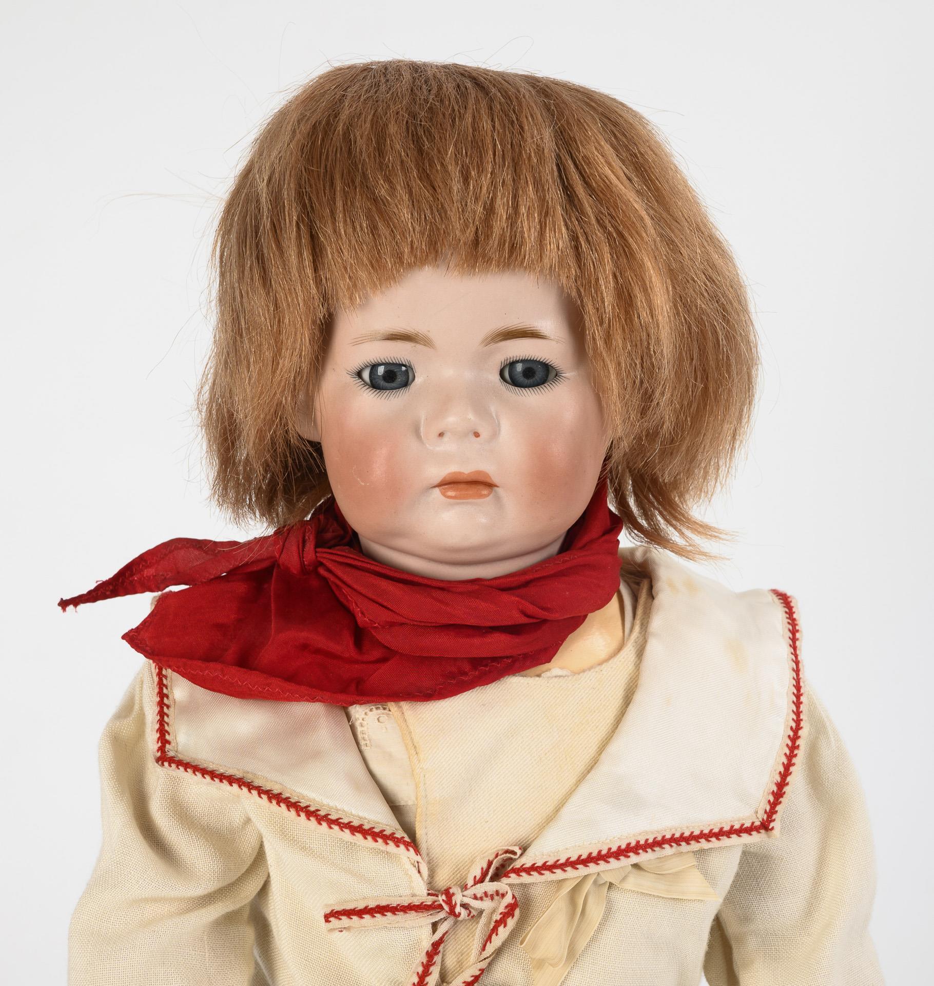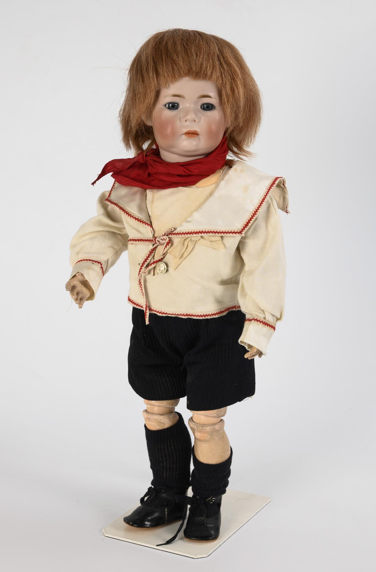 Kurbelkopf, blaue Schlafaugen, geschlossener Mund, ergänzte rotblonde Echthaarperücke. 17-teiliger Toddlerkörper. Weißes Matrosenhemd, schwarze Strickhose, schwarze Schuhe und Stümpfe. Kopf durchleuchtet: ohne Defekte.