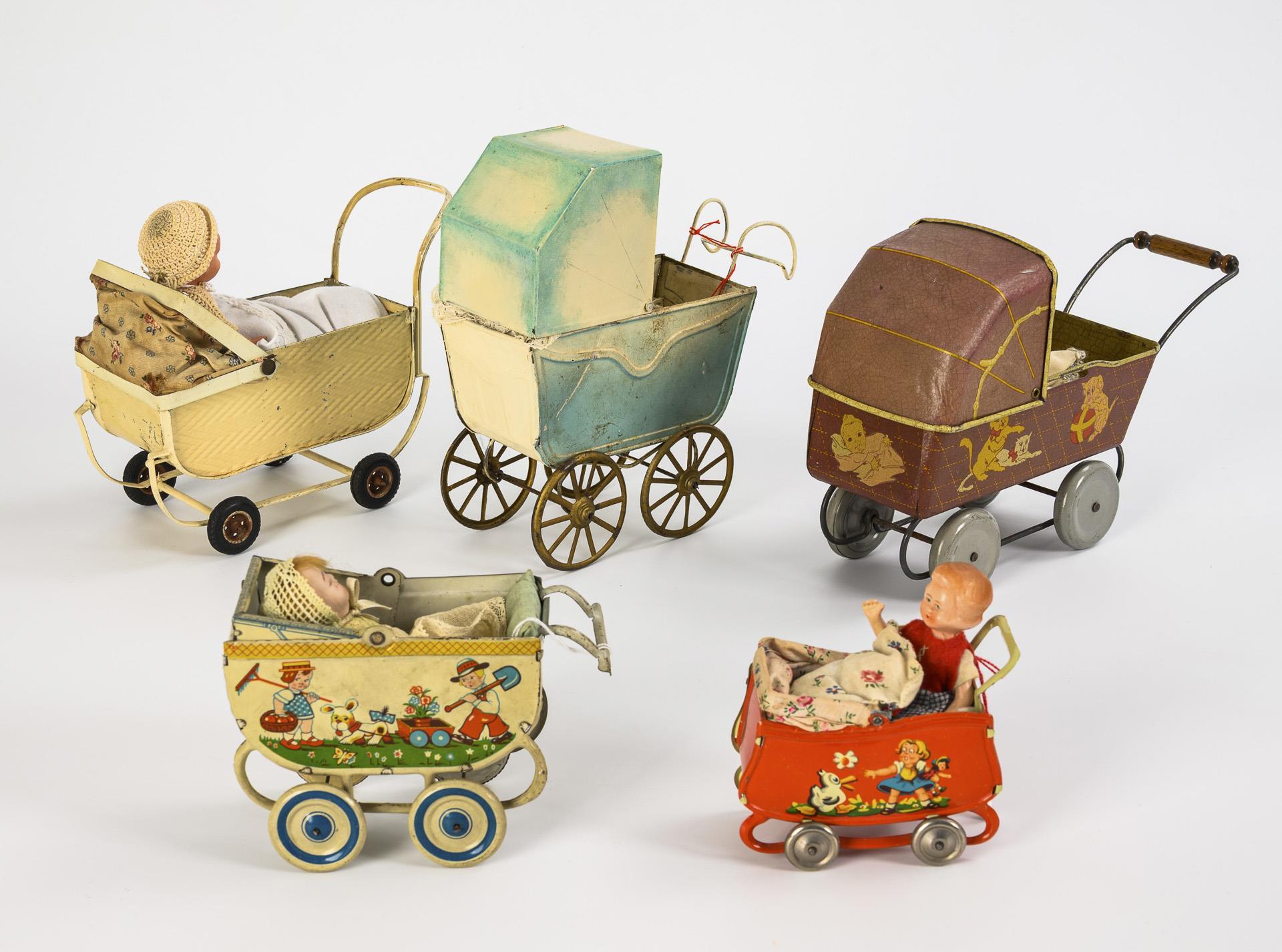 5 kleine Puppenwagen und 4 Püppchen.