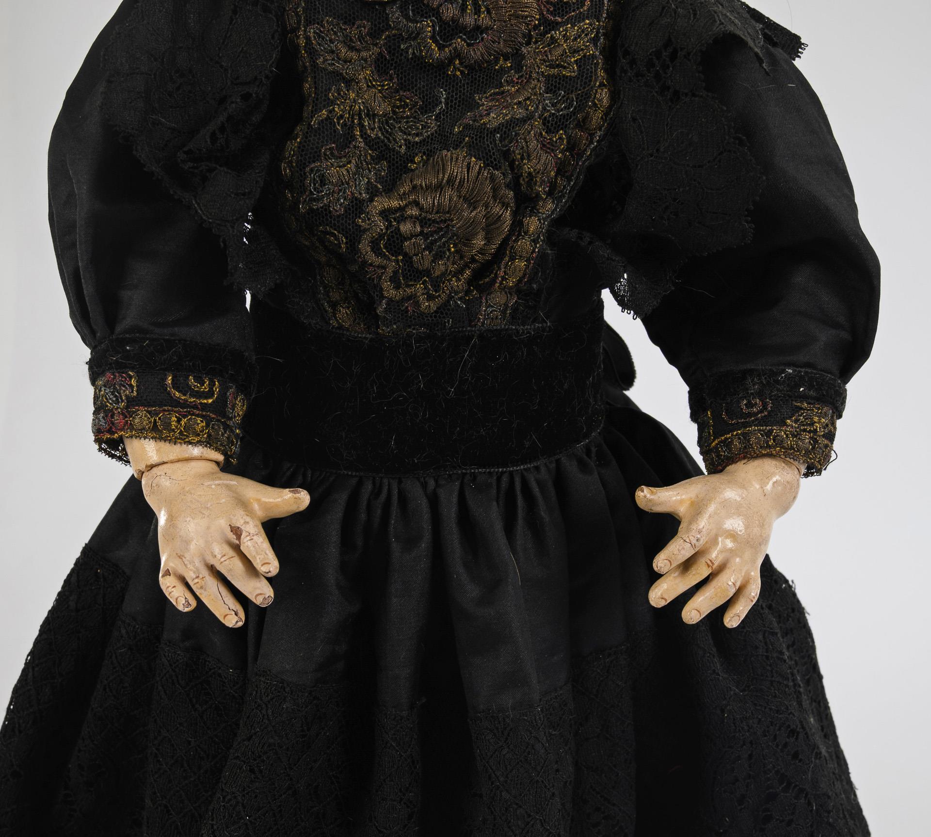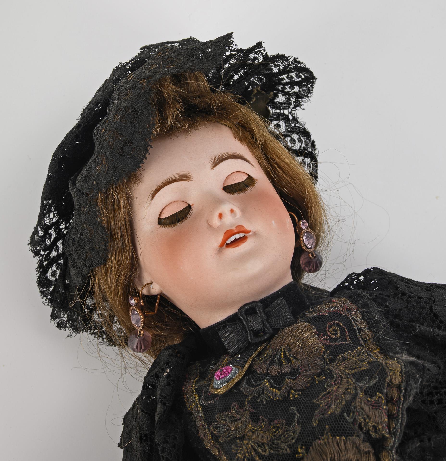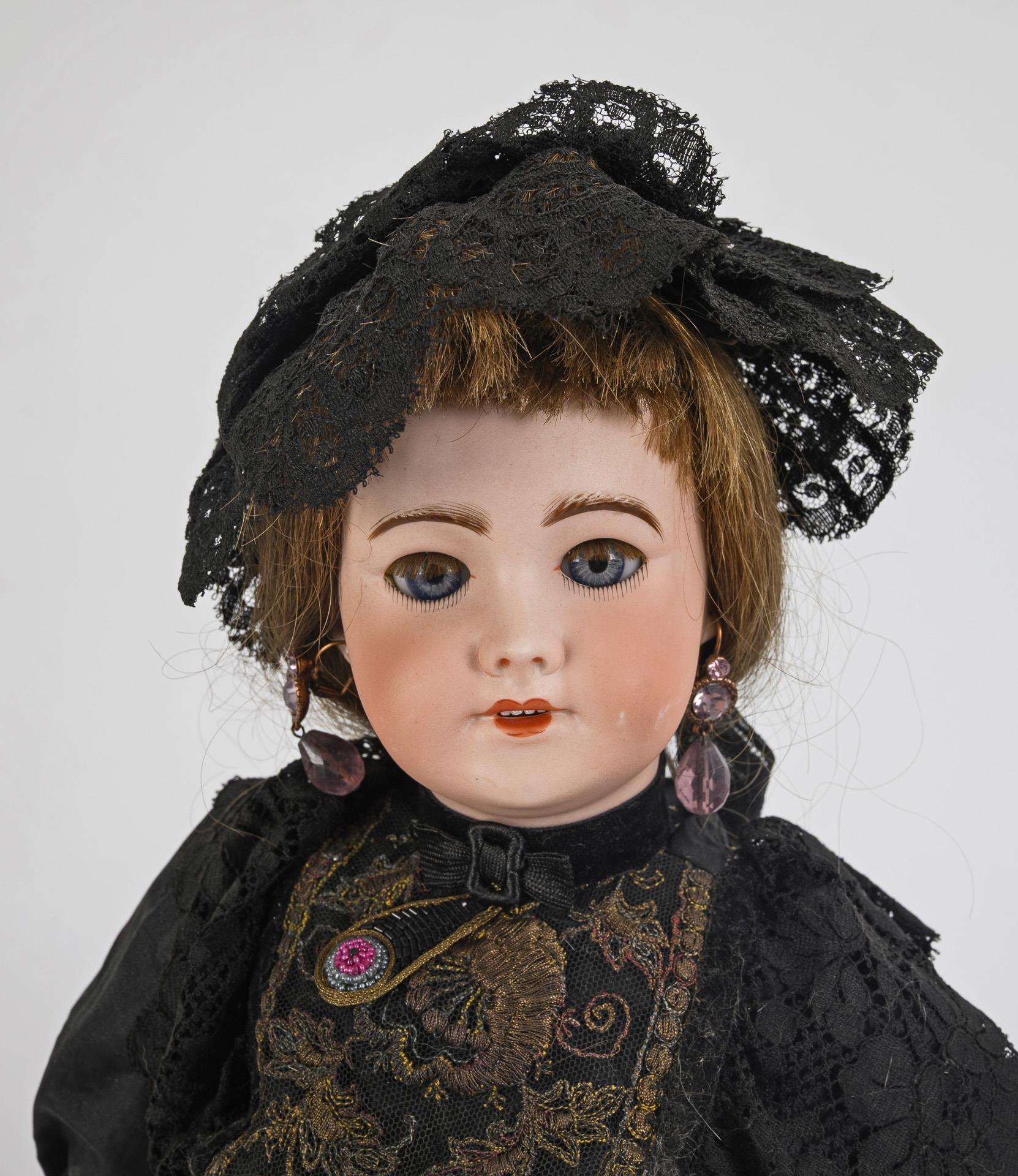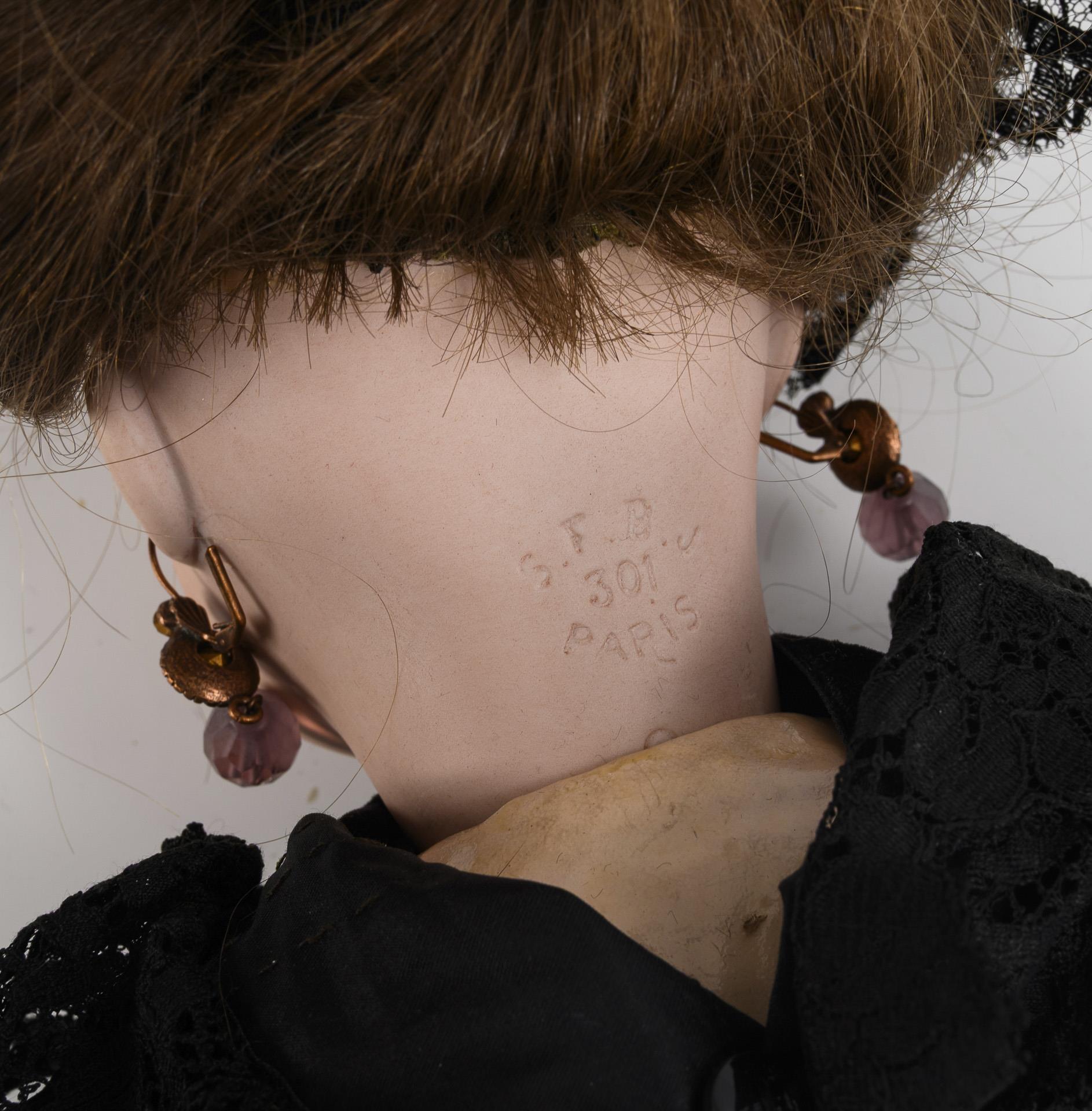 Französische Puppendame in schwarzem Kleid. Société Francaise de Fabrication de Bébés et Jouets.