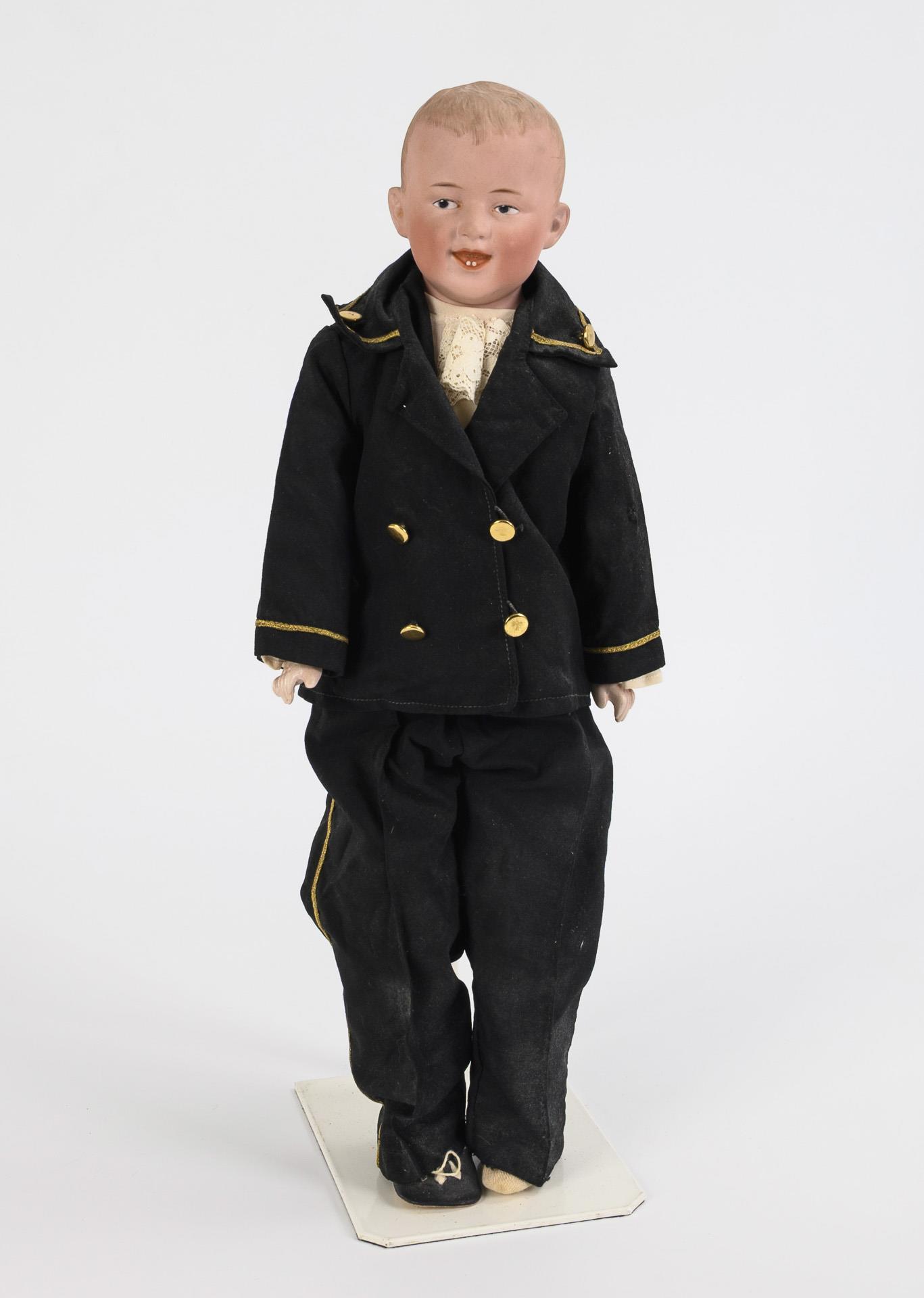 Vollkopf, dunkle Intaglio-Augen, offen-/geschlossener Mund, 2 gemalte Zähnchen, modellierte blonde Haare. Schlanker Lederkörper, Unterarme aus Biskuit, Beine aus Masse. Schwarzer Anzug mit goldenen Knöpfen, 1 Schuh fehlt. Kopf ohne sichtbare Defekte, beide Fußsohlen etwas ausgebessert.