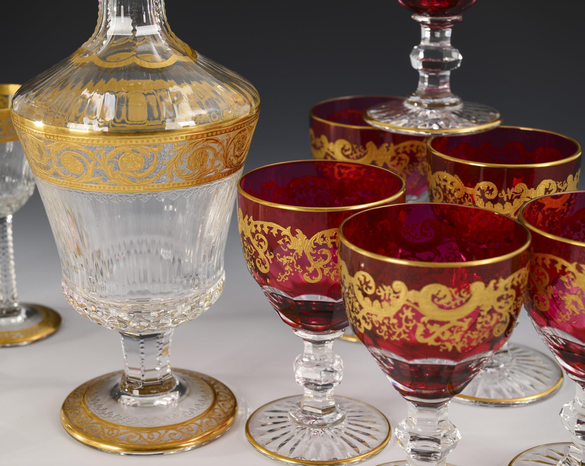 1x Serie "Thistle Gold": Farbloses Glas mit vegetabilem Ätzgolddekor; Karaffe (H 27 cm) und 6 Likörgläser (H 11 cm). / 1x Serie "Trianon": 6 Kelchgläser mit purpurfarbenem Überfang und Ätzgold-Rocailledekor (H 10 cm). Spitze des Karaffenstopfens minimal bestoßen.