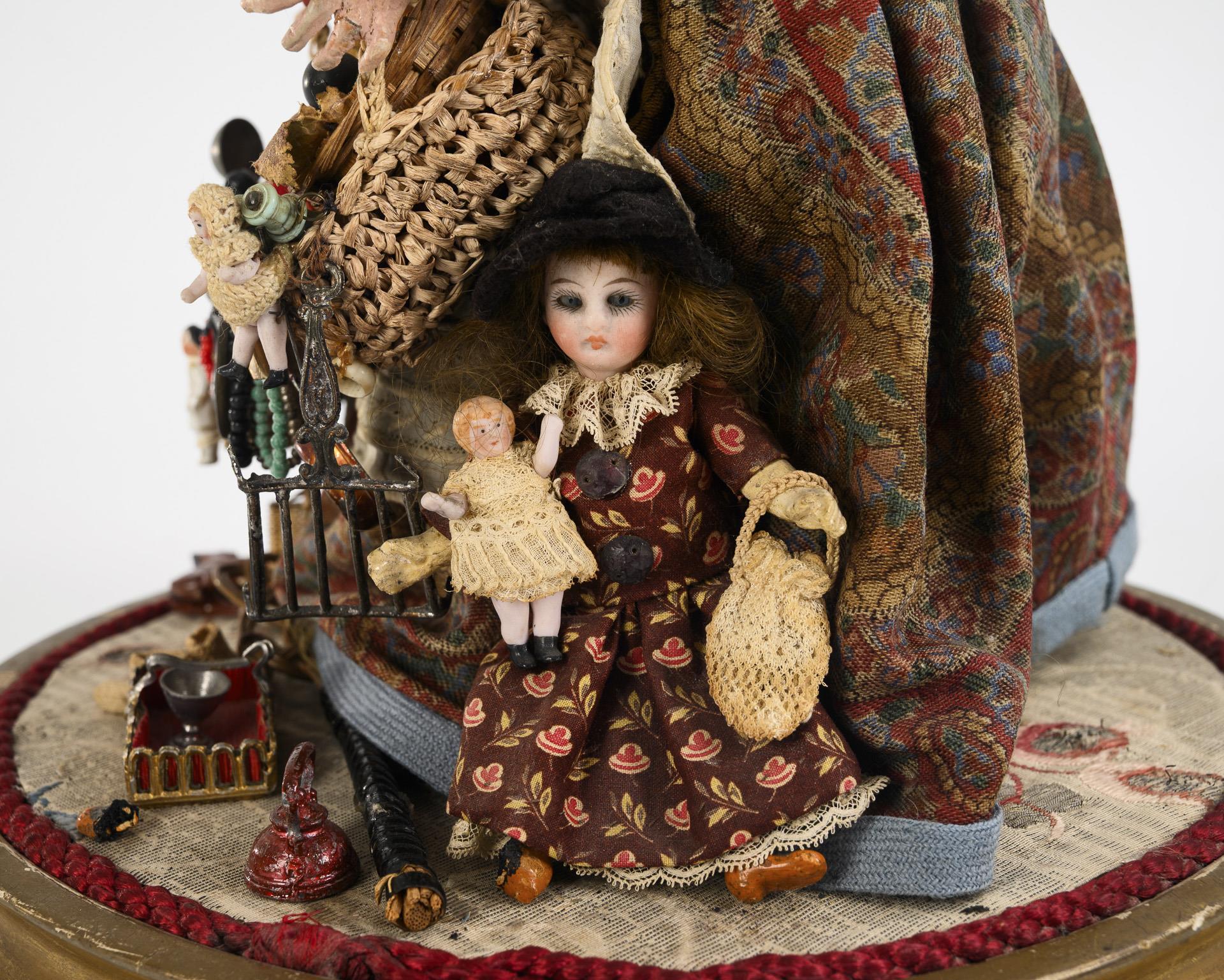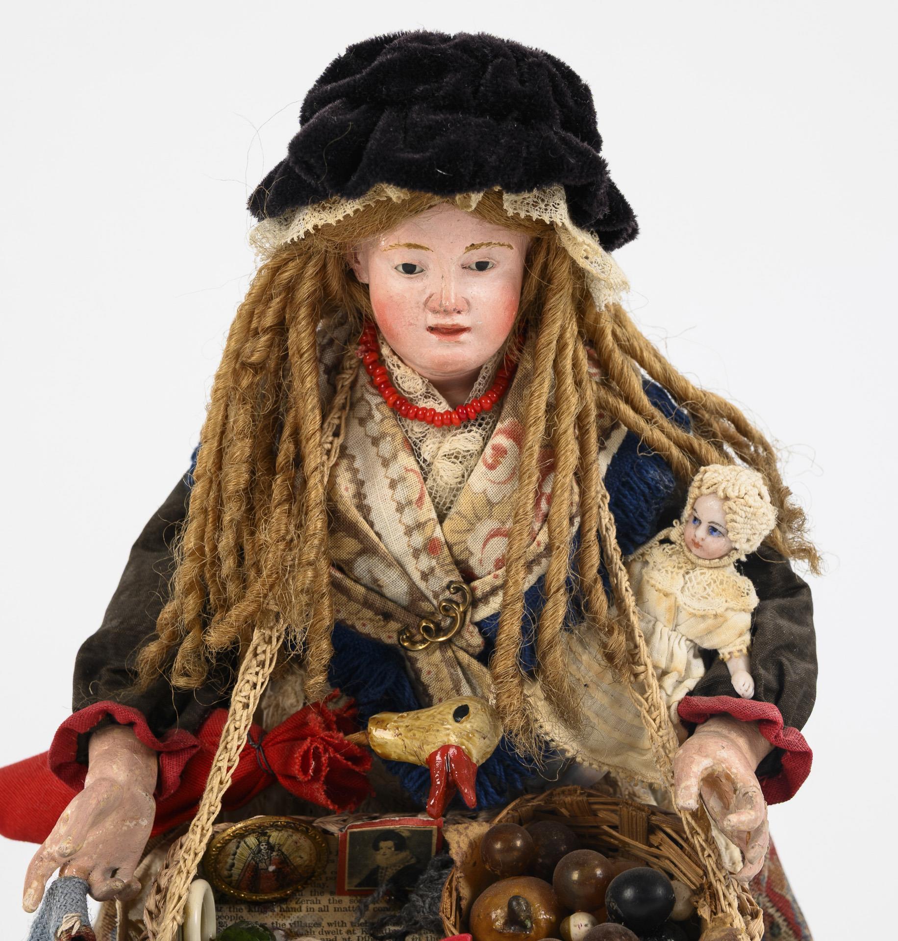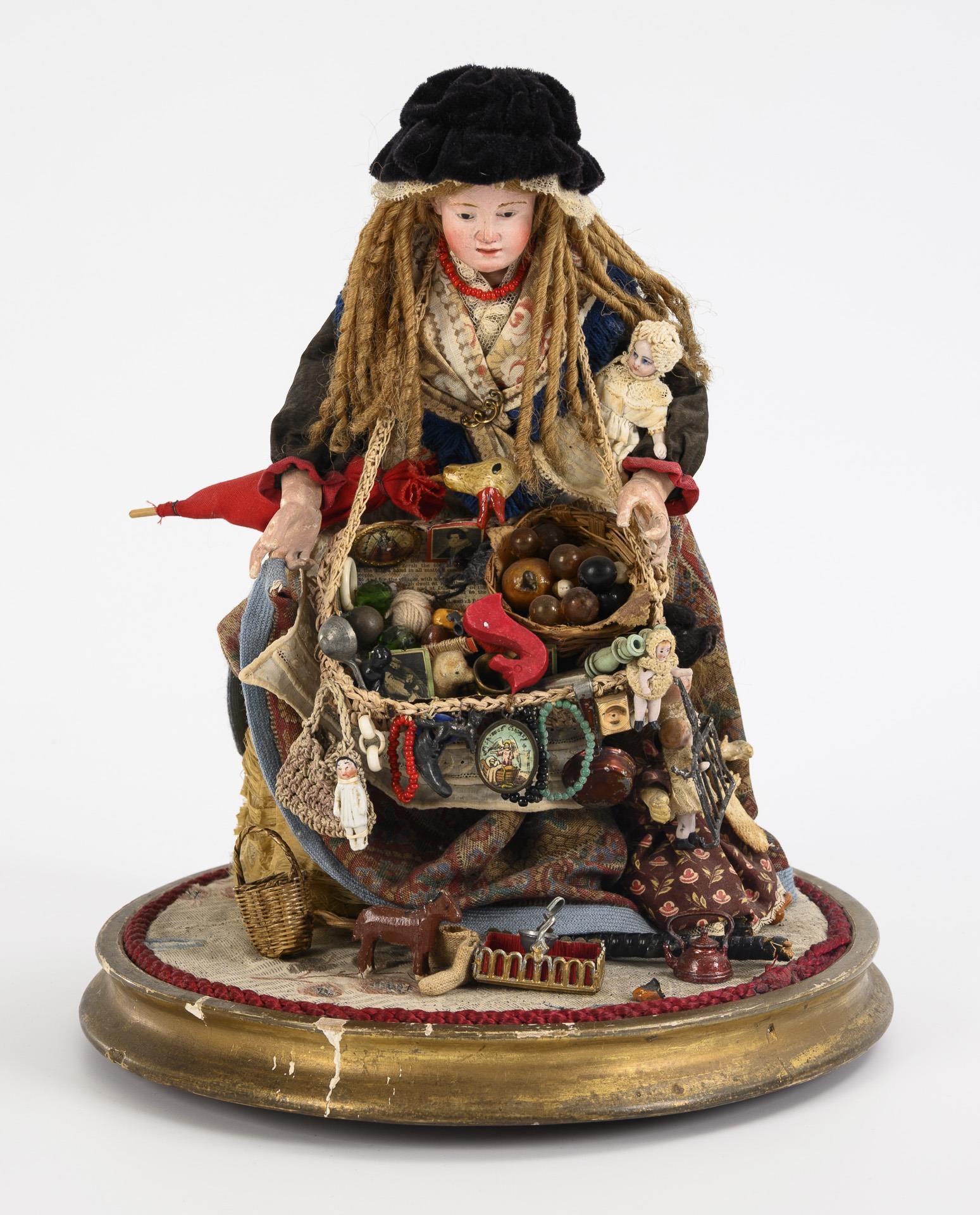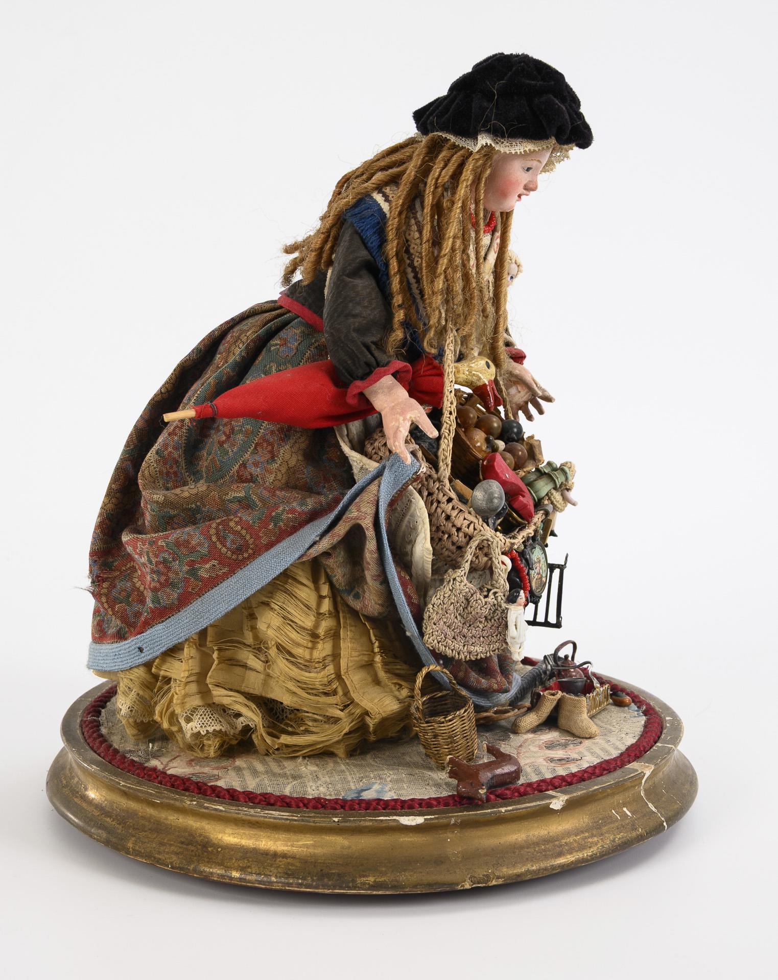 Massekopf mit eingelegten Glasaugen, Mohairhaare, Stoffkörper und Masseglieder. Gemustertes Kleid mit Schürze, schwarzer Samthut. Dazu umgehängter Bauchladen mit verschiedenen Waren und Spielzeug. Defekte, mehrere Finger geklebt.