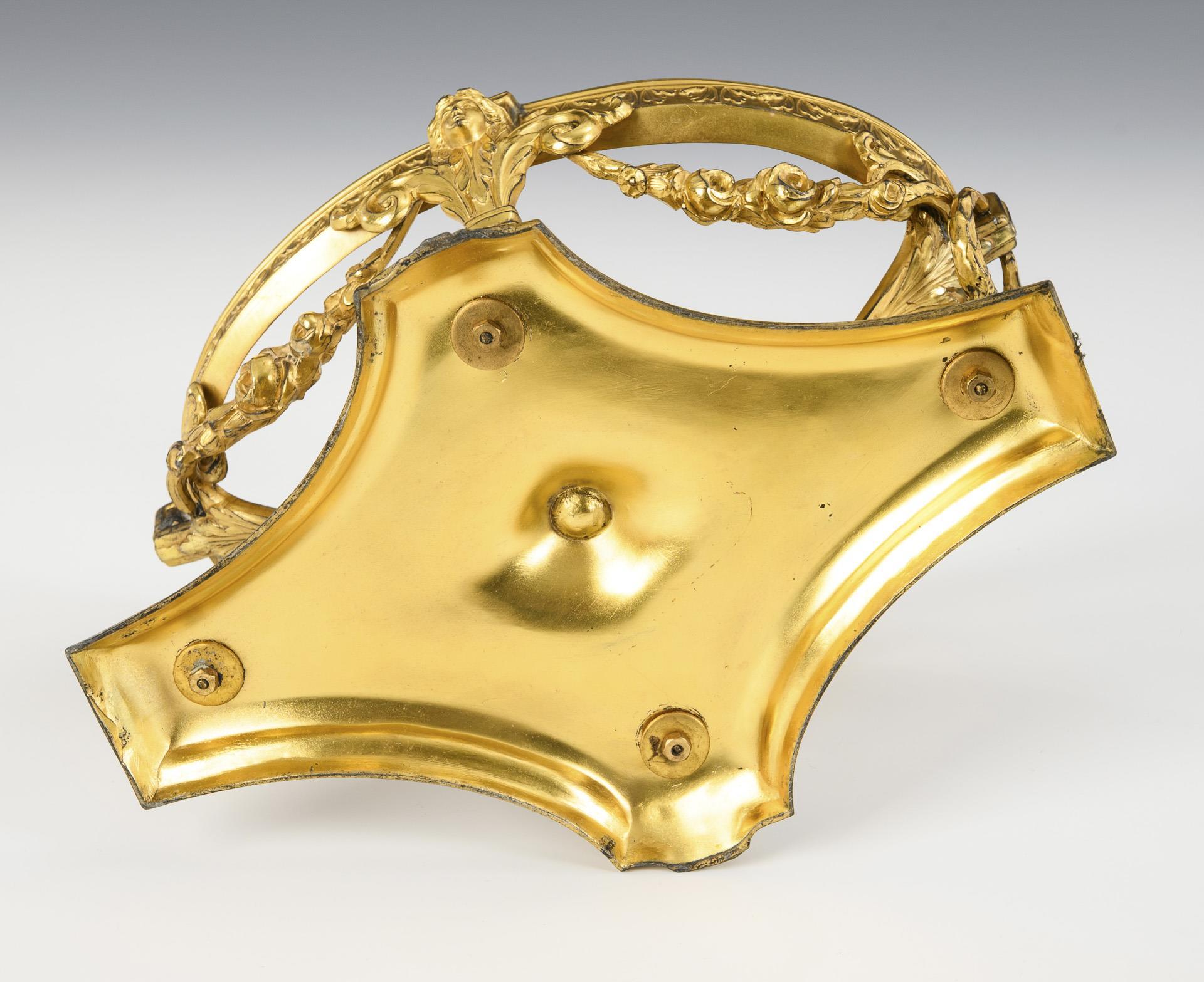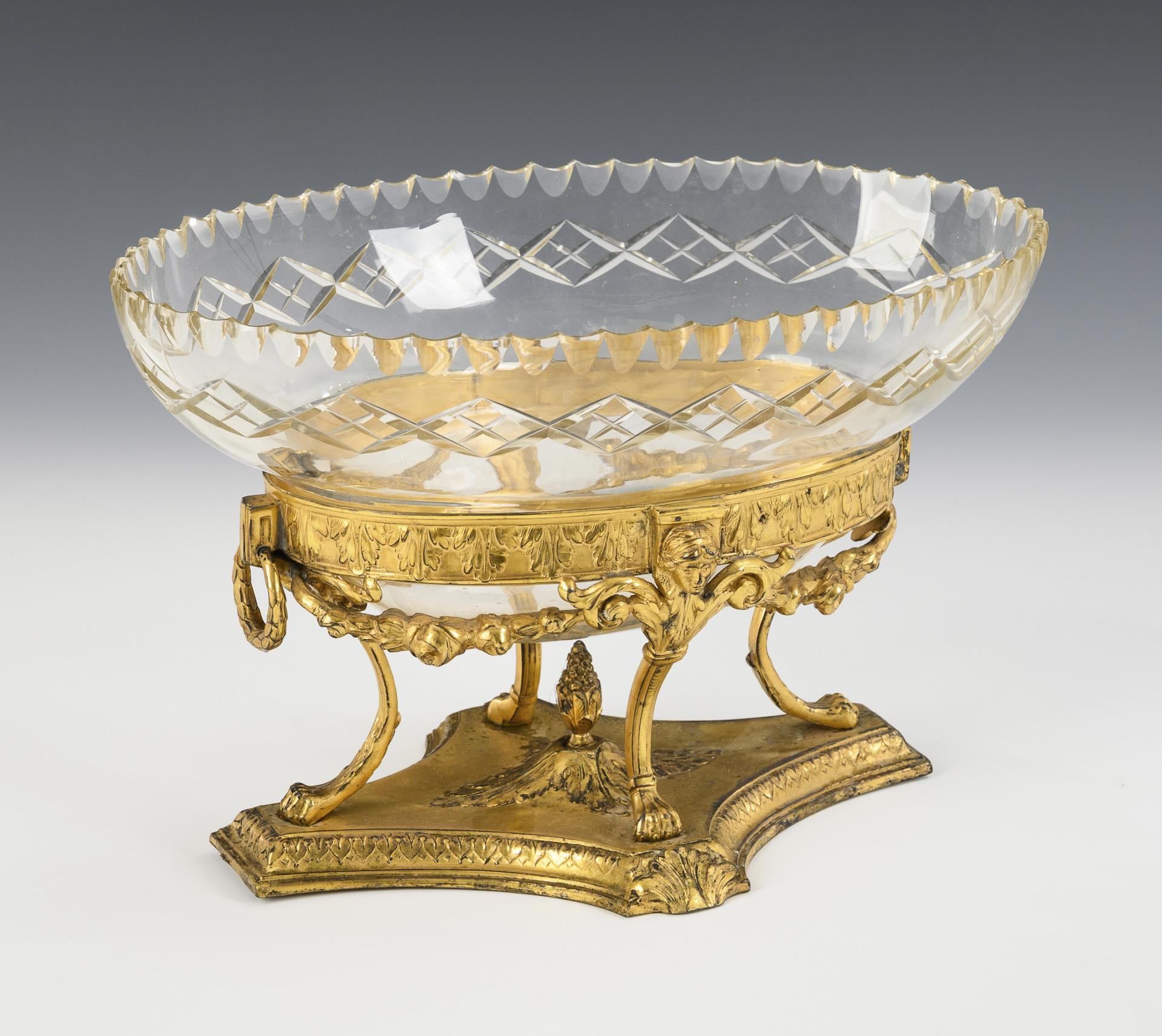 Goldfarbener Fuß im Empire-Stil, geziert von Akanthusmotiven und Blumengirlanden, mit Glaseinsatz. Fuß verbogen, ein Griff fehlt, kleiner Chip am Glaseinsatz.