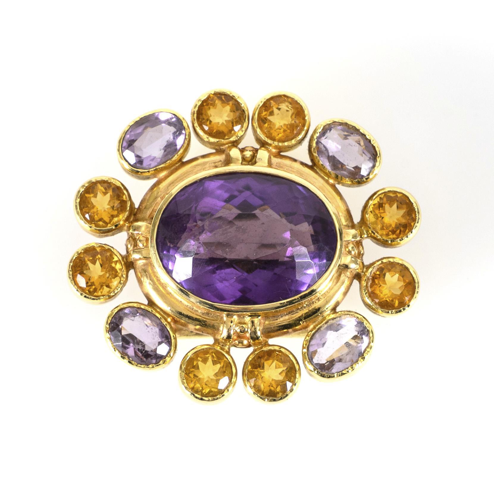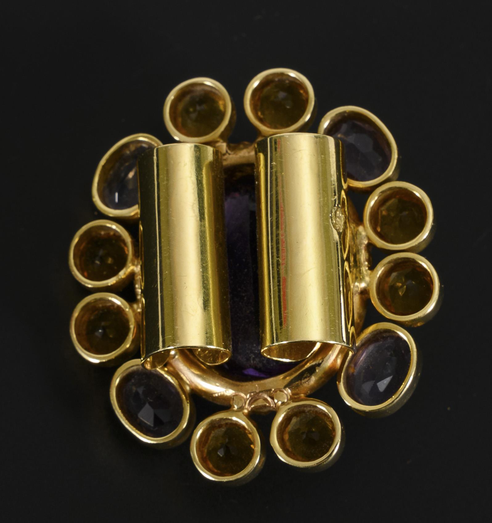 Ungewöhnlicher Anhänger mit einem Farbsteinbesatz aus ovalfacettierten Amethysten und rundfacettierten orangefarbenen Farbsteinen, wohl Citrinen. Rückseitig mit 2 breiten Durchläufen für Ketten oder Kordeln (Länge je 21,13 mm, Innendurchmesser 7,59 mm).