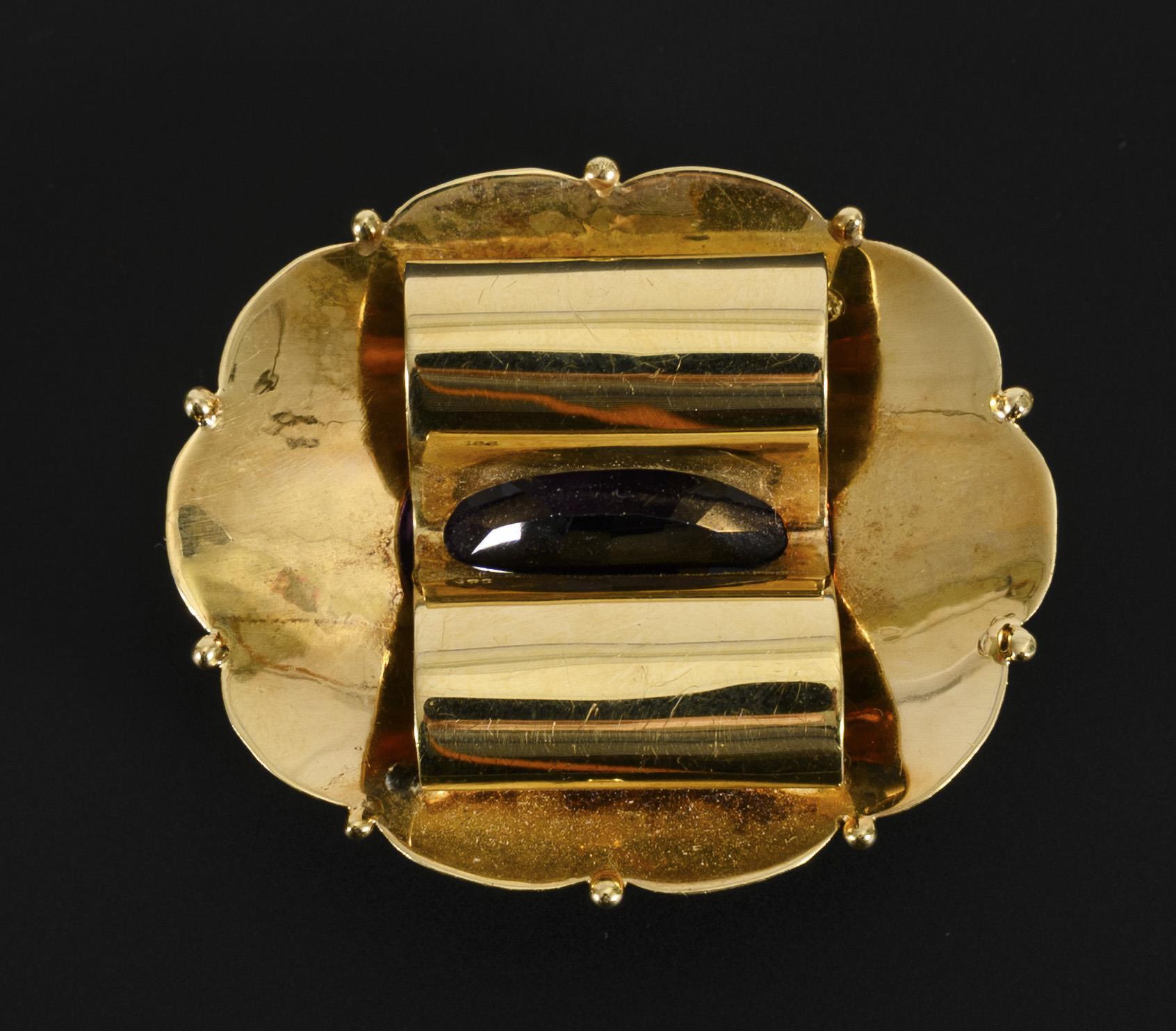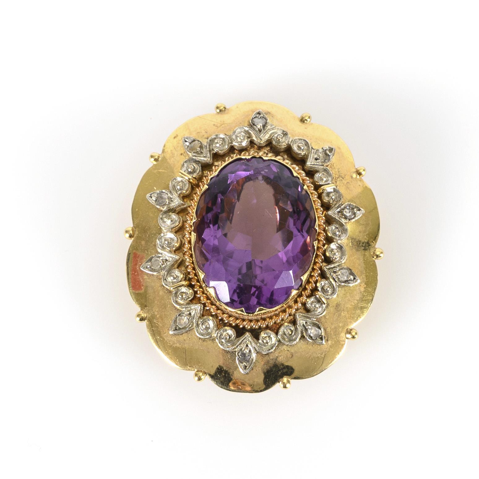 Großer Anhänger mit einem ovalfacettierten Amethysten in Zargenfassung, dieser umgeben von einem mit kleinen Diamanten im Rosenschliff ausgefassten, ornamentalen Silberband. Rückseitig mit 2 breiten Durchläufen für Ketten oder Kordeln (Länge je 19,80 mm, Innendurchmesser 9,07 mm). Leichte Tragespuren, einige kleine Kratzer auf der Tafel des Amethysten, einer davon etwas augenfällig (Länge ca. 2,04 mm).