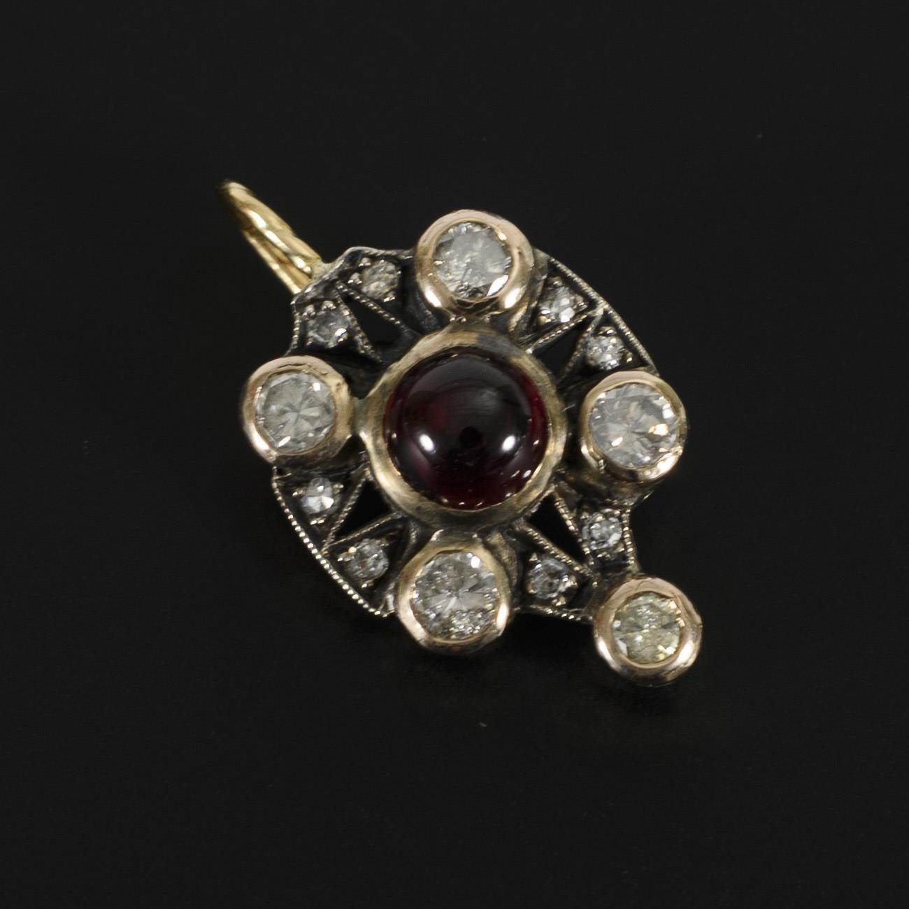 Anhänger, wohl ursprünglich aus einem Ohrring entstanden und umgearbeitet bzw. neu ausgefasst. Mittig mit einem großen Granat-Cabochon besetzt, dazu 5 Brillanten mit deutlichen Einschlüssen sowie 8 kleinere, eingelassene Diamanten. Die Fassungen der Steine und die rückseitige Verbödung in Gelbgold, der Anhängerkorpus in Silber gehalten. Die Öse, bzw. der ehemalige Ohrbügel, starr.