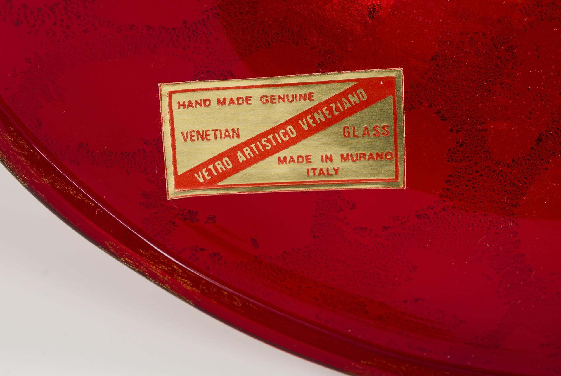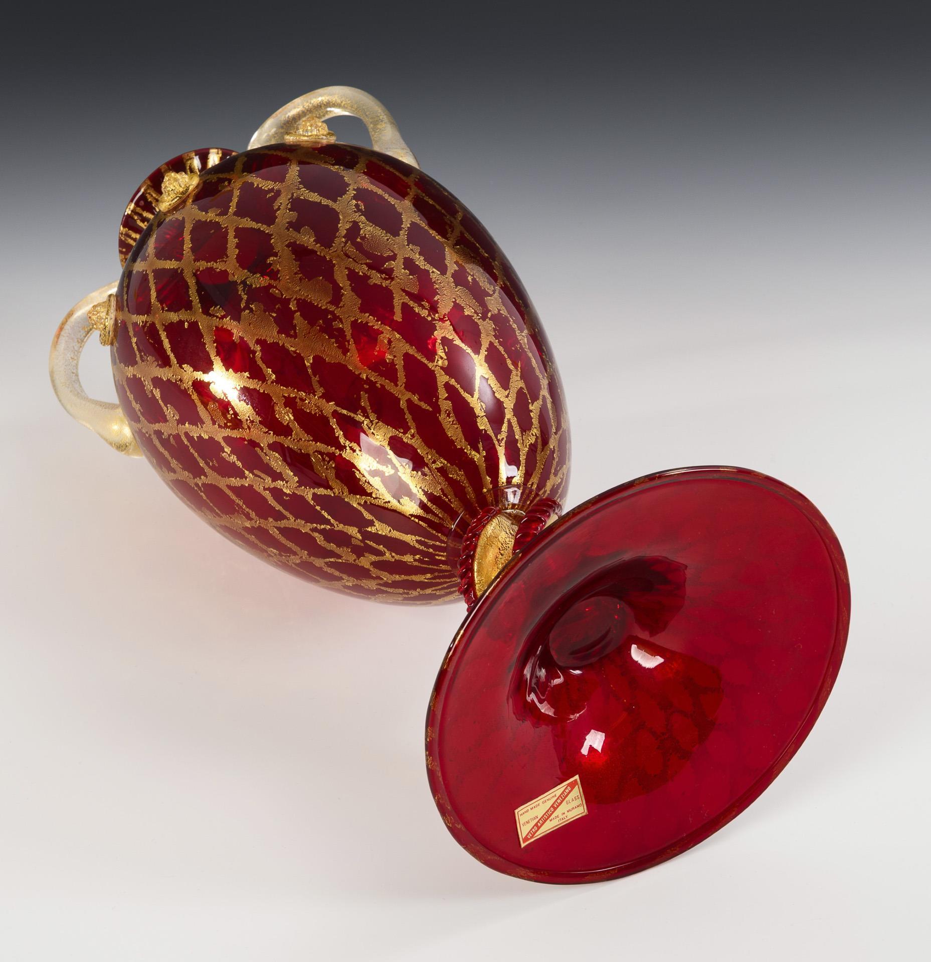 Ovoider Korpus aus rubinrotem Glas, mit sechs aufgeschmolzenen Beerennuppen, zwei Henkeln, kurzem, gedrehtem Schaft und Rundfuß. Auf der Wandung ein Netzmuster aus fein gesprengter Goldfolie.