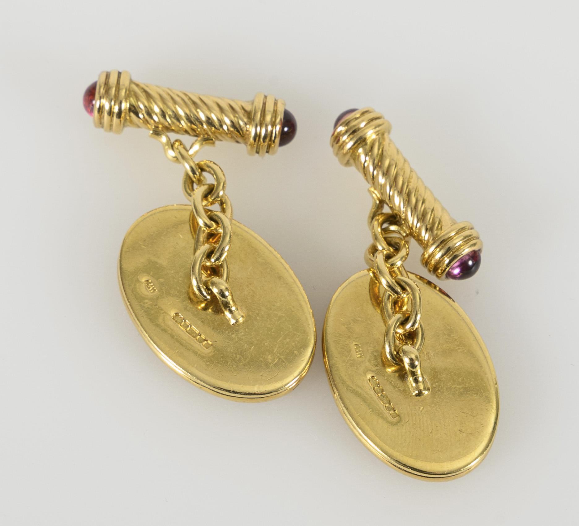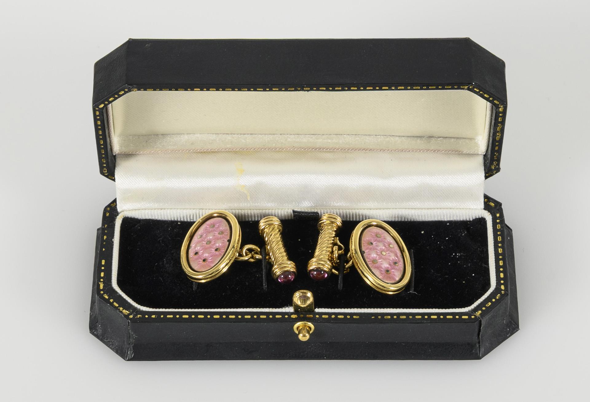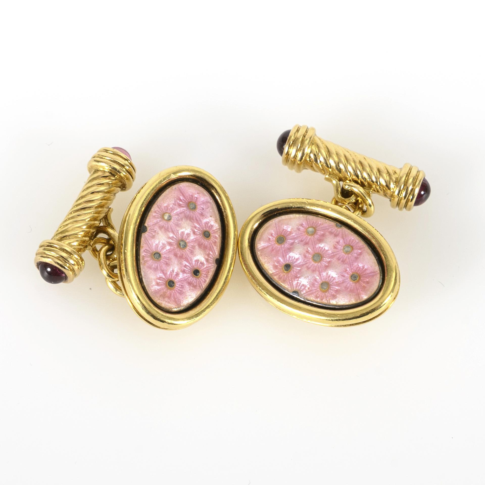 Manschettenknöpfe der Marke Alabaster & Wilson mit großen, ovalen Köpfen, diese mit einem an Sterne erinnernden Muster in rosafarbener Emaillierung. Die gedreht-gebändert verzierten Enden je zu beiden Seiten mit rosafarbenen Farbstein-Cabochons besetzt und klassisch durch Ketten mit den Kopfstücken verbunden. Leichte Tragespuren.