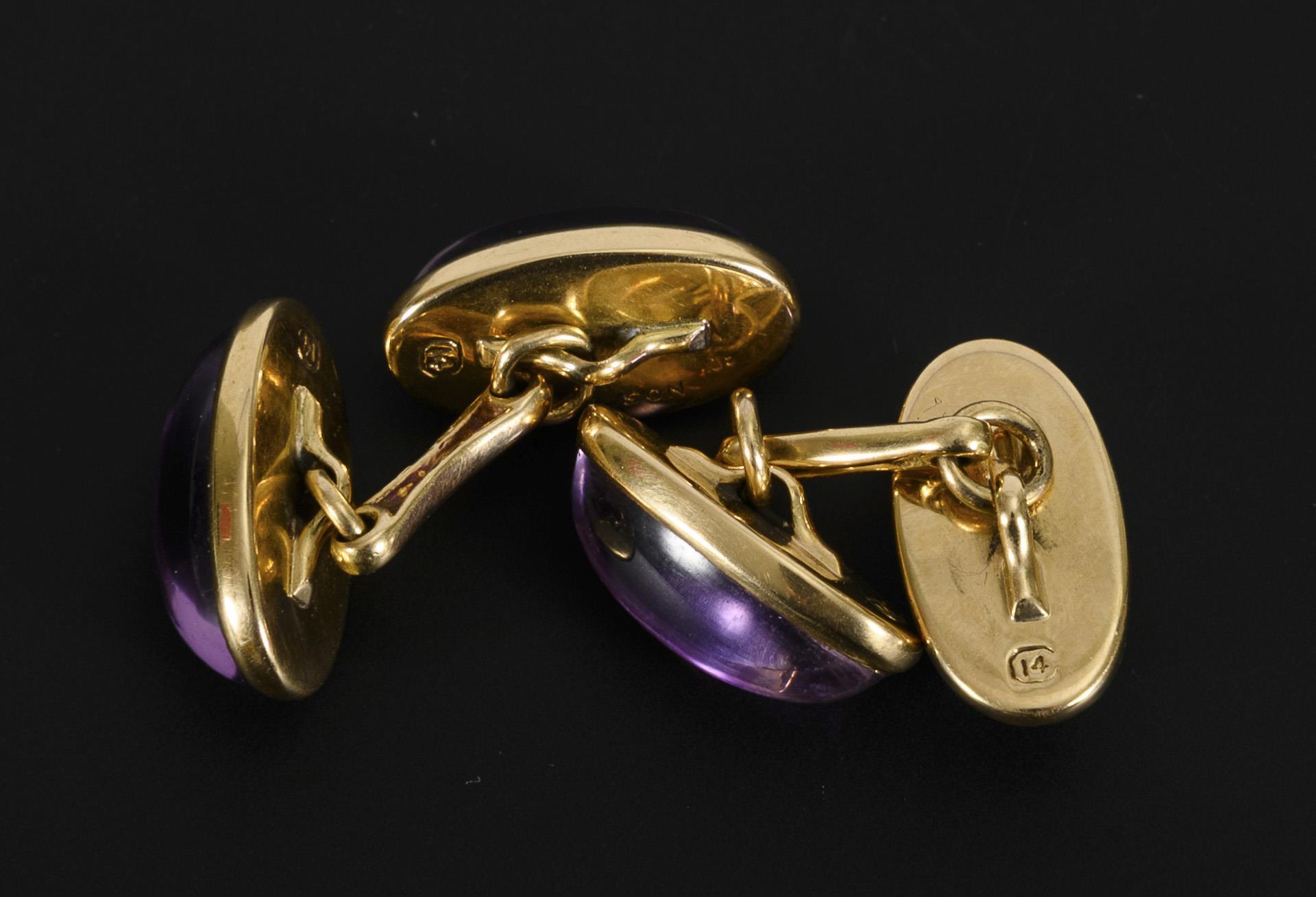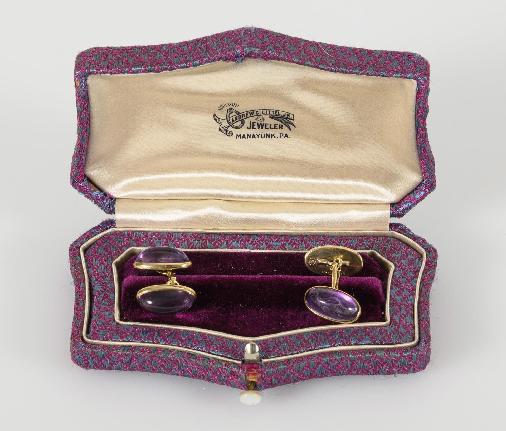 Manschettenknöpfe mit länglichen Amethyst-Cabochons in historischem Etui.
