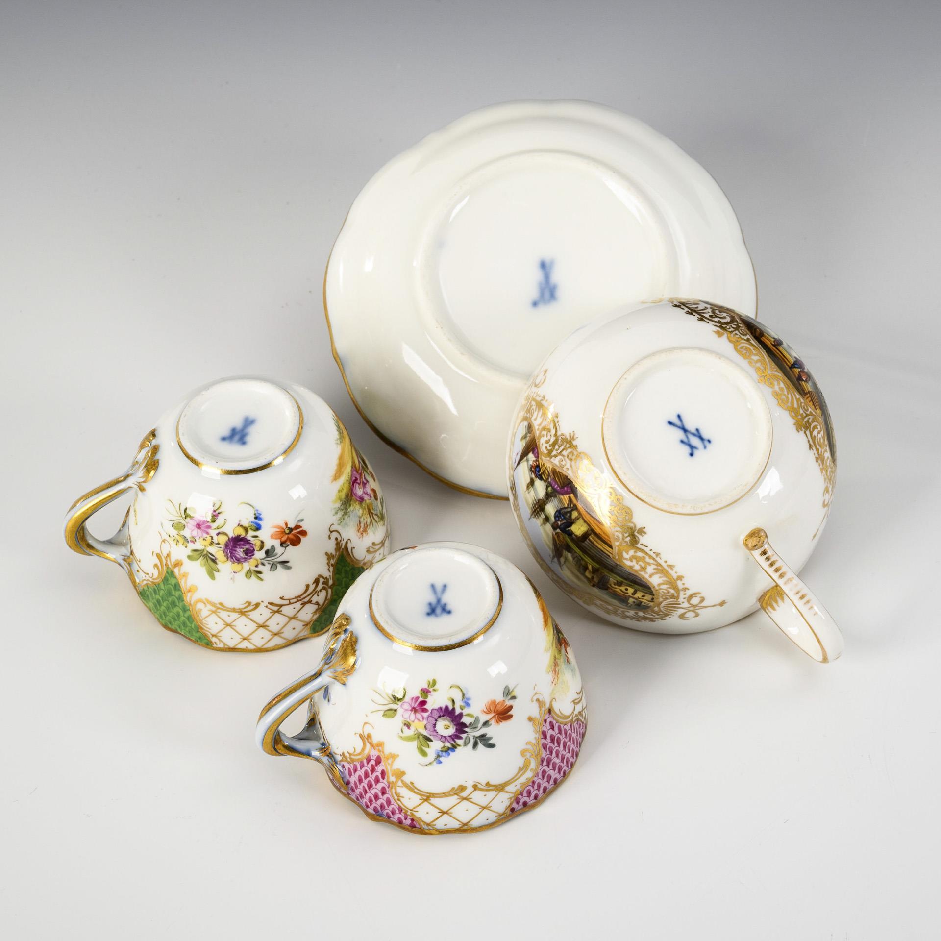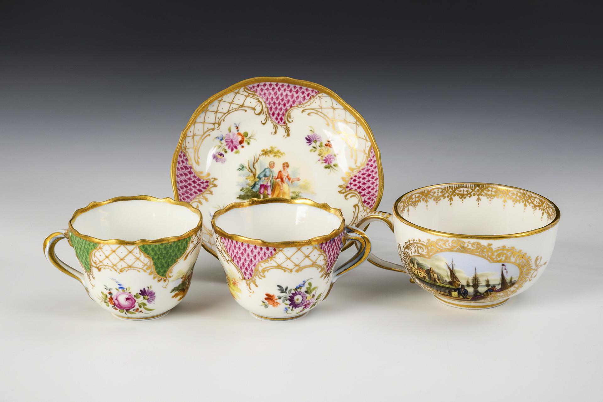 Form "Neuer Ausschnitt": 2 Mokkatassen mit Watteau-Malerei, Blumenmalerei und grünem bzw. purpurfarbenem Schuppenteilfond sowie 1 passende Untertasse. / 1 Tasse in glatter Form mit Kauffahrteimalerei.