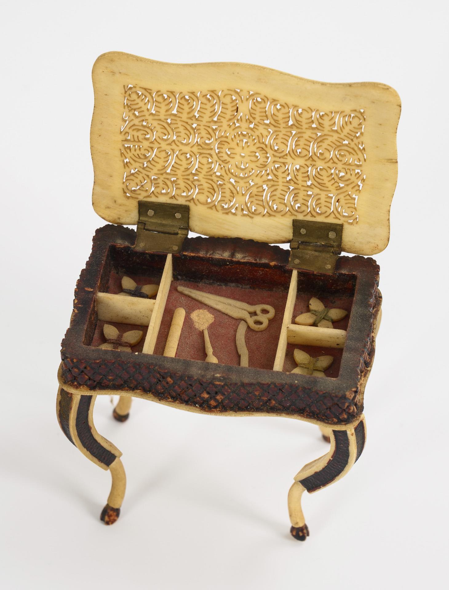 Schönes Konvolut mit Eckregal (H 14 cm), 2 Nähtischchen, Zinnofen, mehreren Bilderrahmen, 2 Uhren, Deckenlampe etc. / Regal sowie weitere Teile mit Defekten.